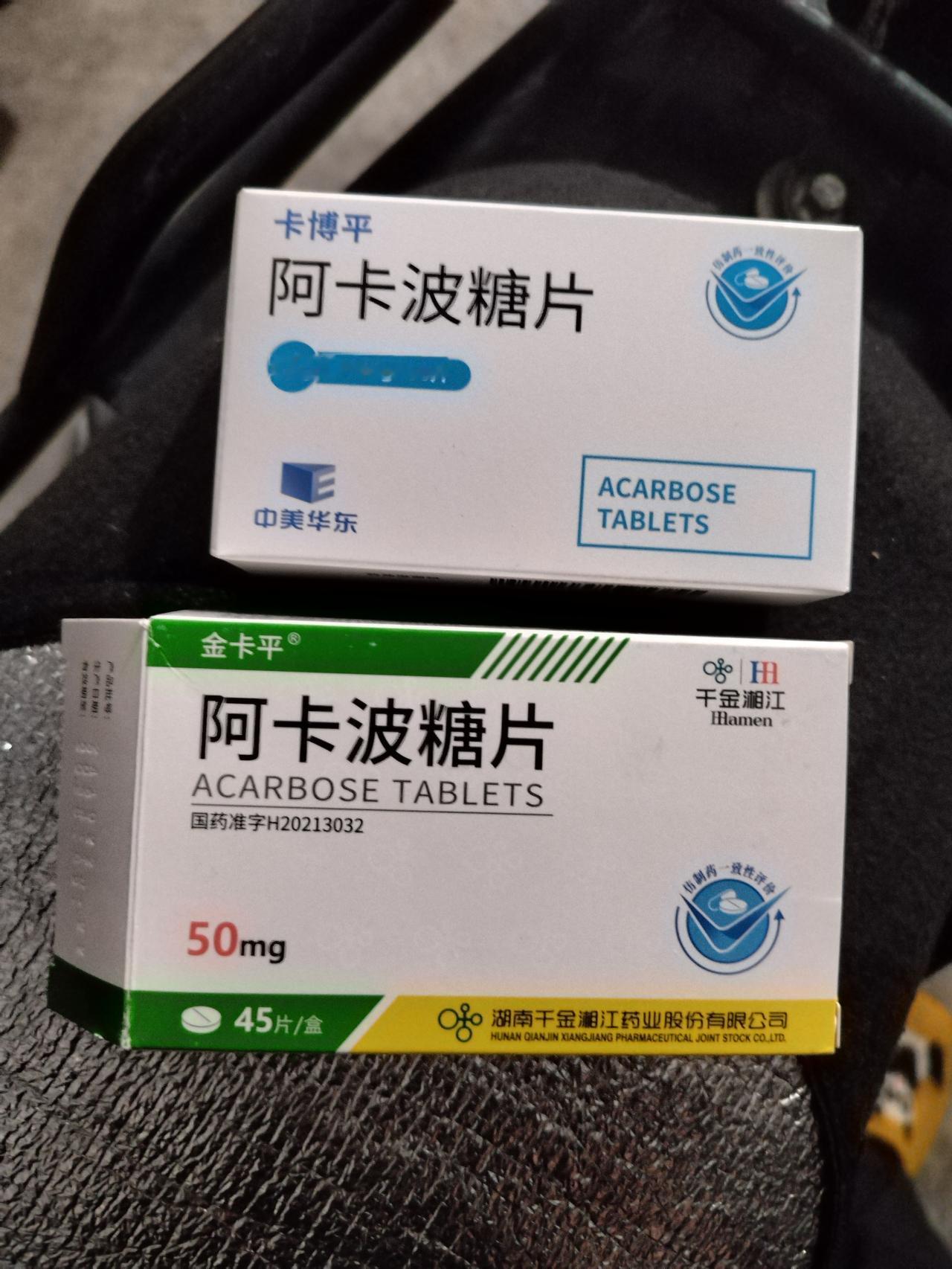 (图片说明:二甲双胍缓释片和阿卡波糖片,上面是医院买的,下面是药店买的)