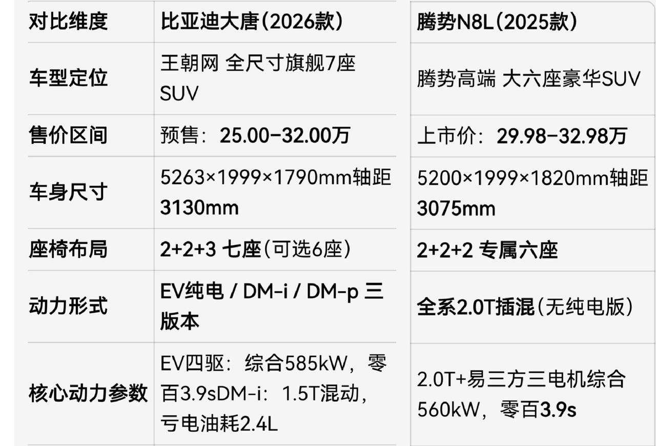 看了一下比亚迪大唐和腾势N8L的配置,感觉老王算是彻底放弃腾势了。