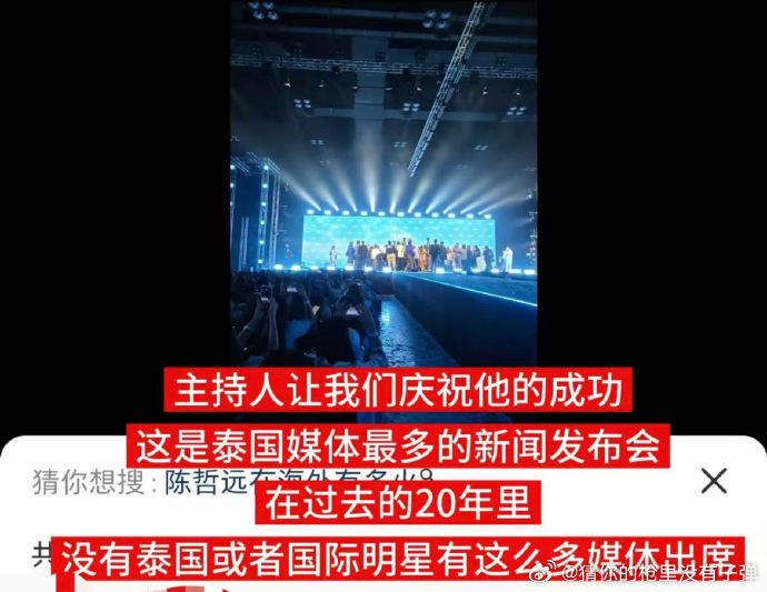 陈哲远泰国发布会182家泰媒到场、陈哲远海外巨星待遇 泰国发布会现场,182 家媒体到场采访陈哲远,人气与关注度双双在线。