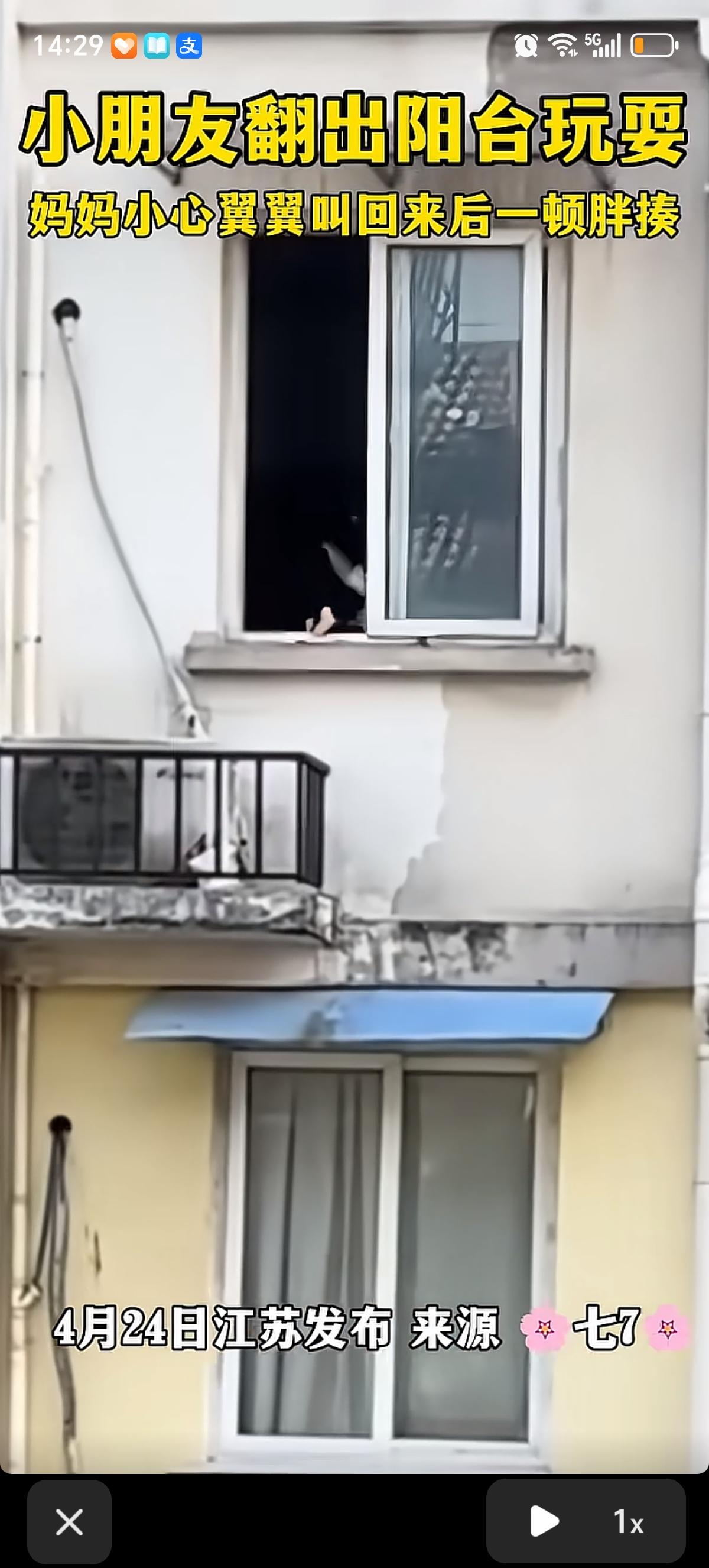 小朋友贪玩,自己顺着窗户翻了出去,落到了放空调外机的平台上。妈妈小心的哄着,在小朋友回来,落在自己手上的瞬间,大巴掌就拍在了小朋友的屁股上,手都挥出了残影,抡出了火星子,真是好一顿胖揍。