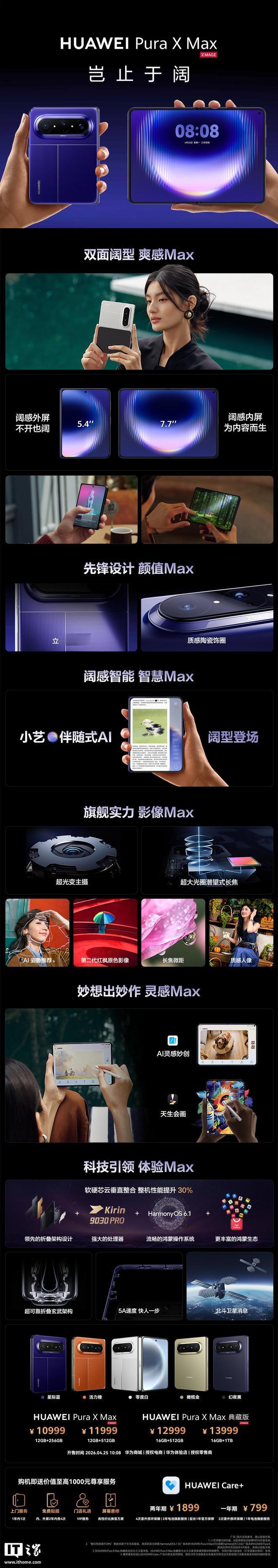 IT之家 4 月 26 日消息,行业首款横向阔折叠手机 —— 华为 Pura X Max 已于 4 月 25 日 10:08 正式开售,搭载麒麟 9030 Pro 处理器,售价 10999 元起。