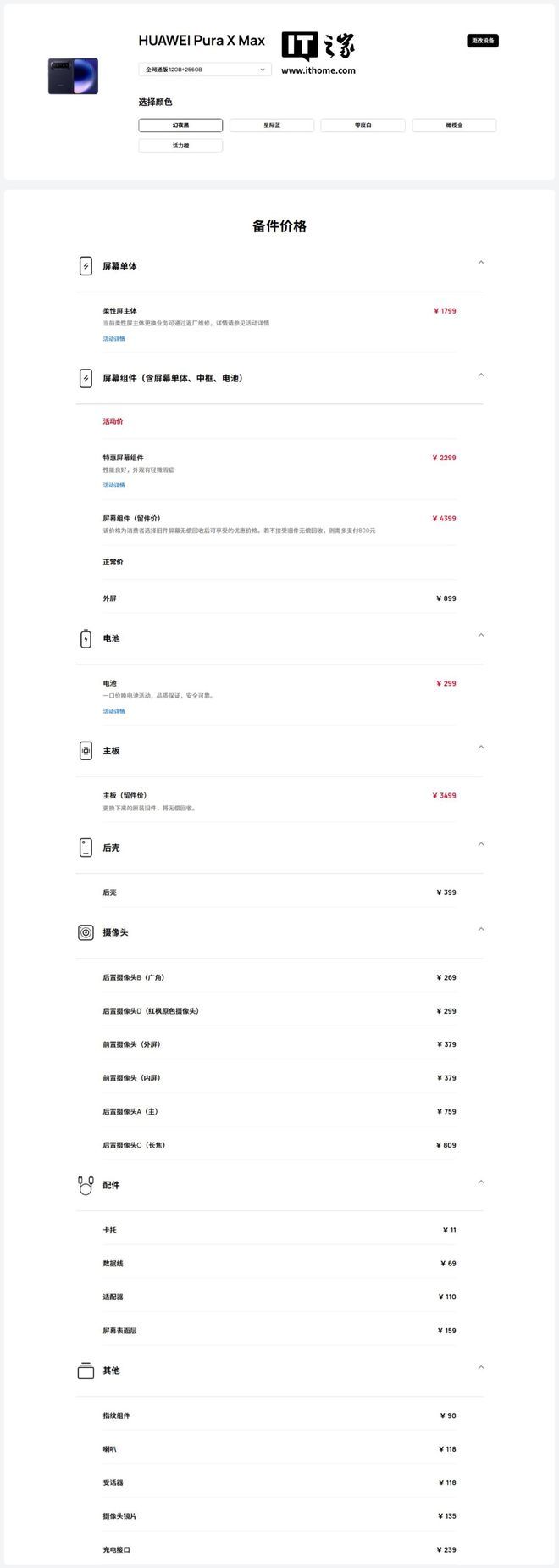 屏幕单体 柔性屏主体:1799 元屏幕组件(含屏幕单体、中框、电池) 特惠屏幕组件:2299 元 屏幕组件(留件价):4399 元 外屏正常价:899 元电池 电池:299 元主板 主板(留件价):3499 元后壳 后壳:399 元摄像头 后置摄像头 B(广角):269 元 后置摄像头 D(红枫原色摄像头):299 元 前置摄像头(外屏):379 元 前置摄像头(内屏):379 元 后置摄像头 A(主):759 元 后置摄像头 C(长焦):809 元配件 卡托:11 元 数据线:69 元 适配器:110 元 屏幕表面层:159 元其他 指纹组件:90 元 喇叭:118 元 受话器:118 元 摄像头镜片:135 元 充电接口:239 元
