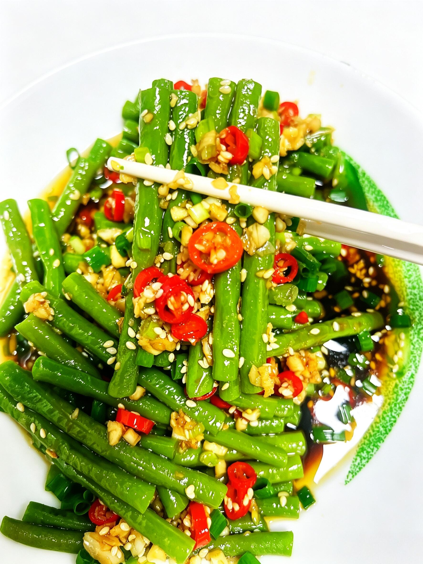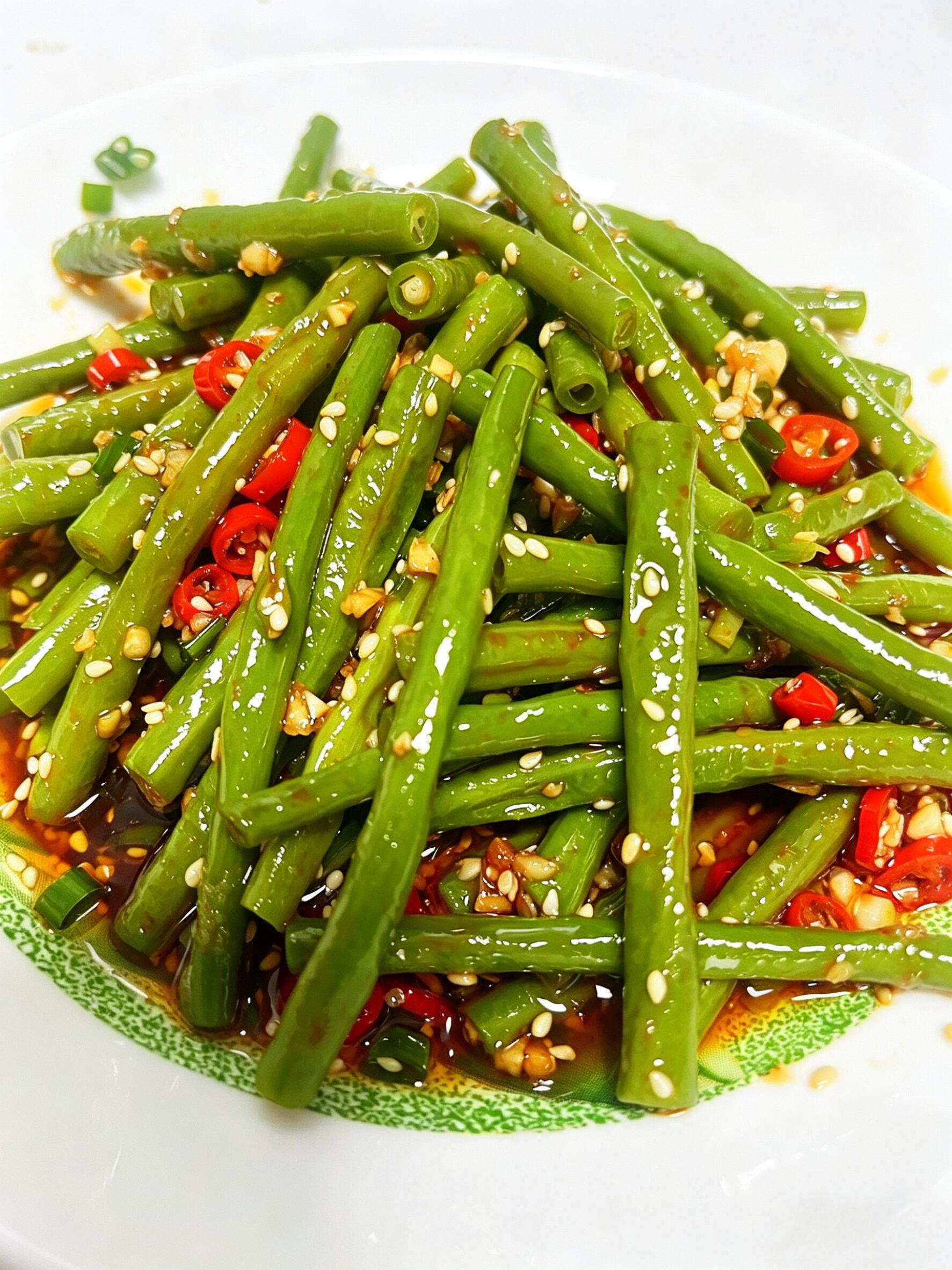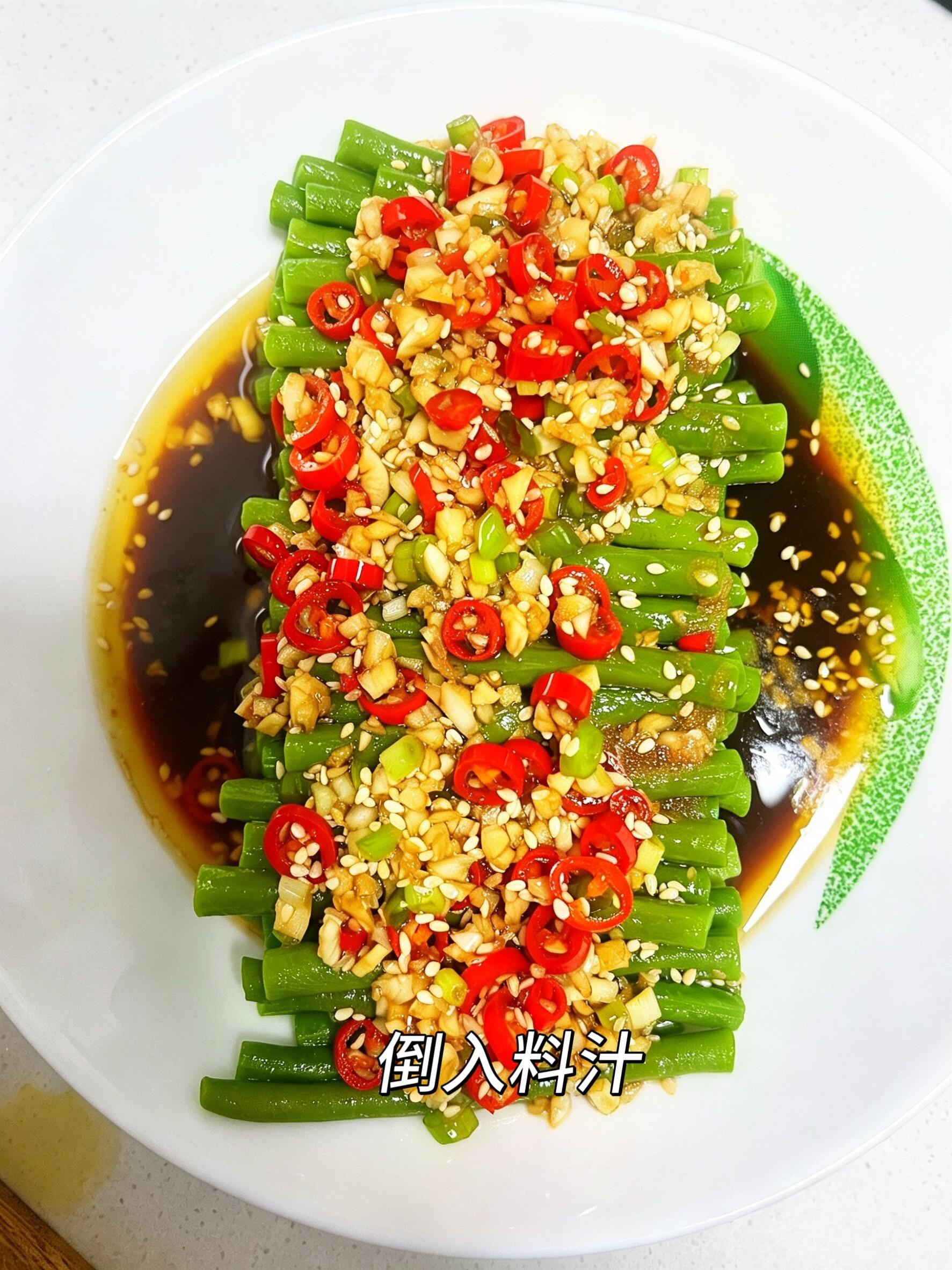 新鲜豇豆一把、小米辣、蒜末、葱花、白芝麻
