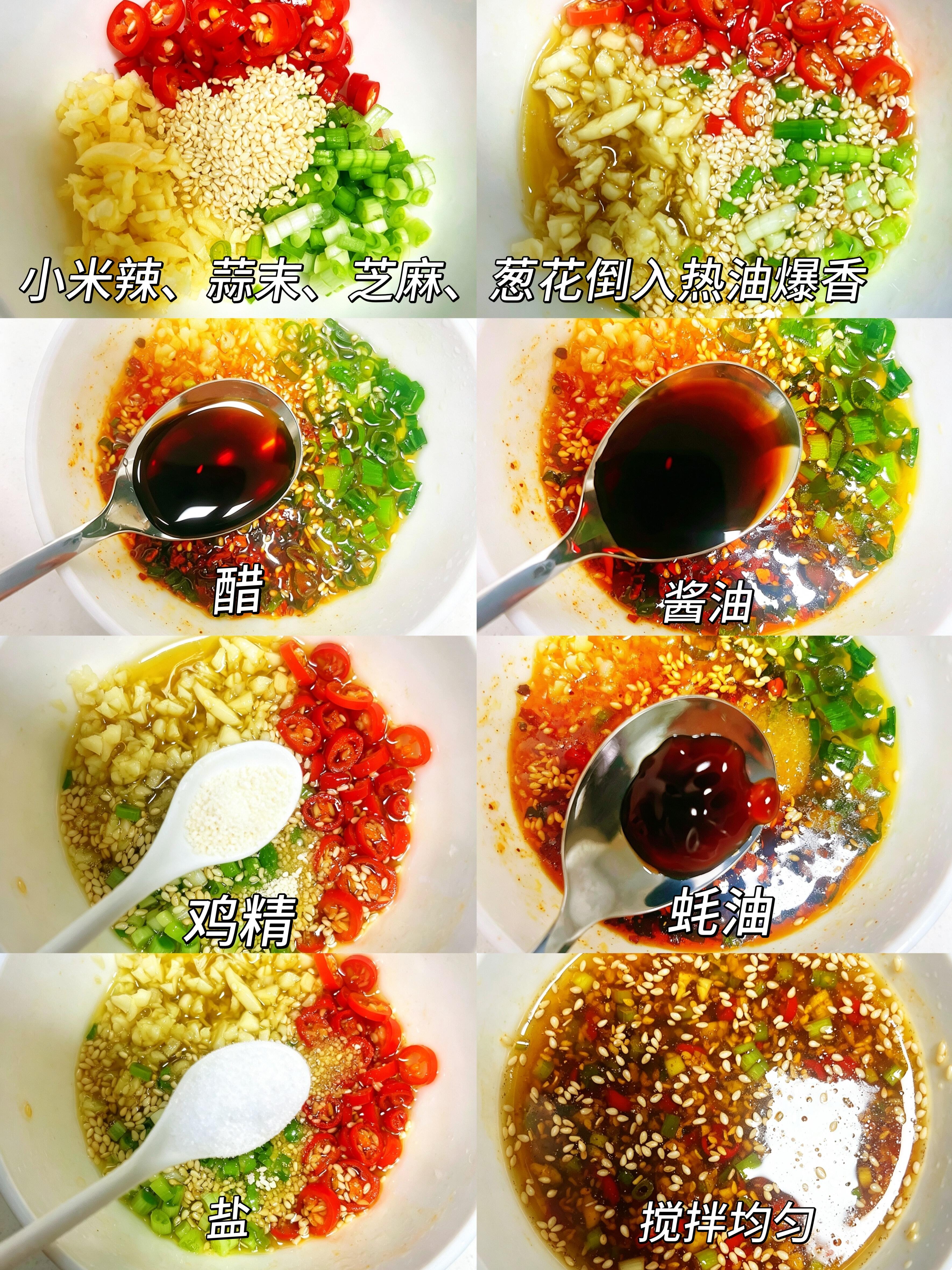 2️⃣ 碗中放蒜末、小米辣、葱花、白芝麻,淋上滚烫的热油,香味儿瞬间就出来了