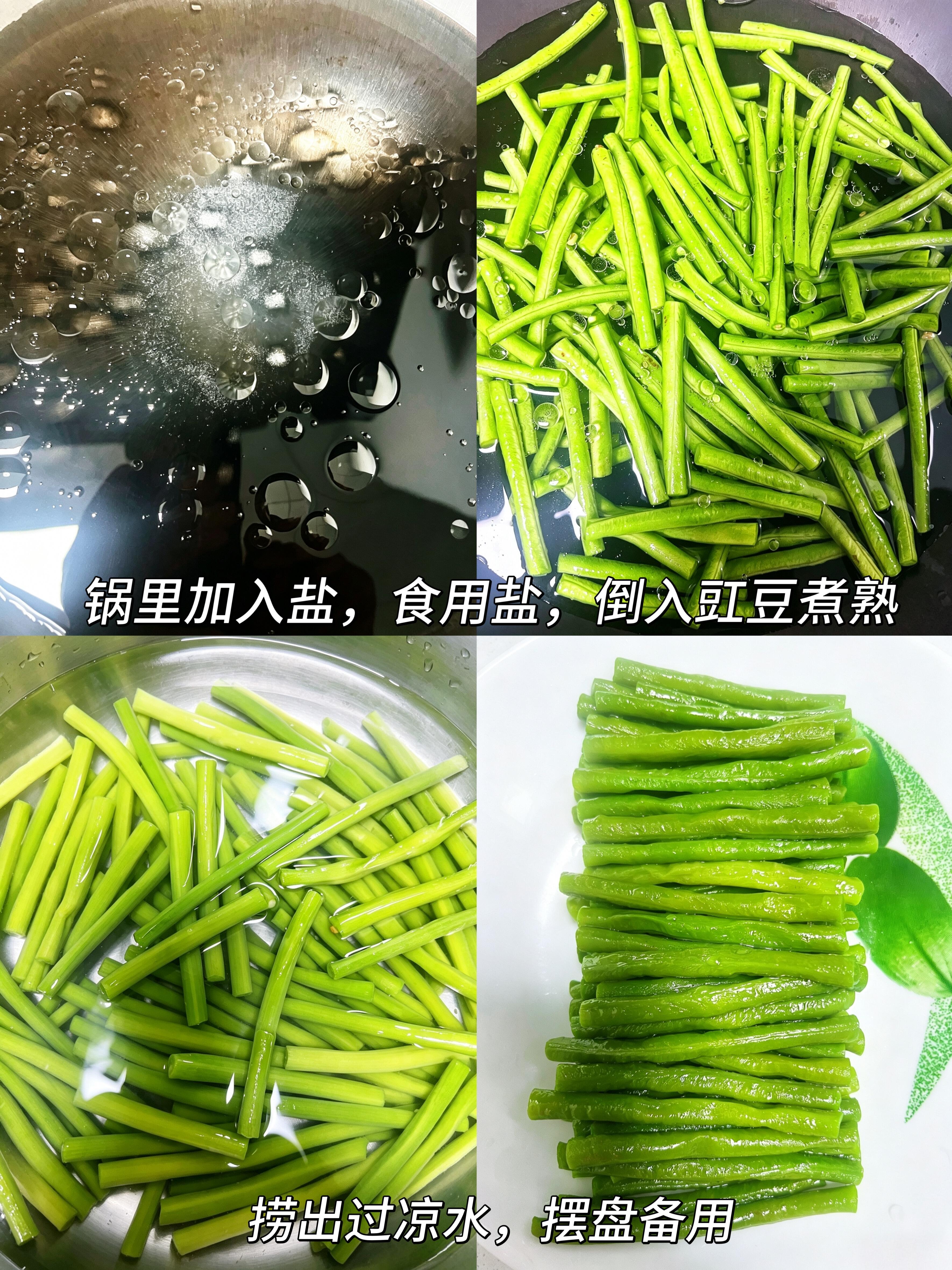 1️⃣ 豇豆洗净切段,水开加少许盐和油,煮3-5分钟,断生捞出过凉水,口感更脆爽