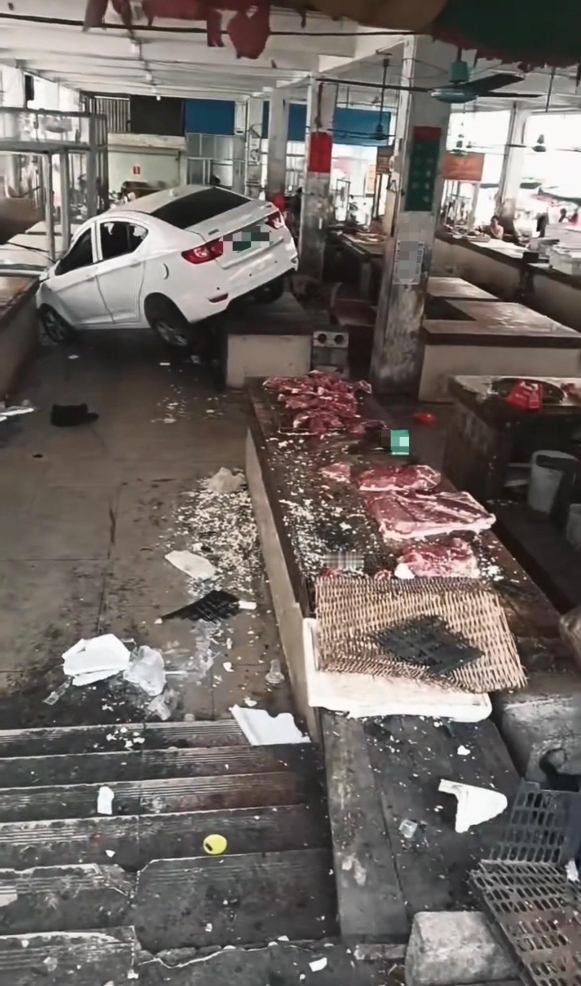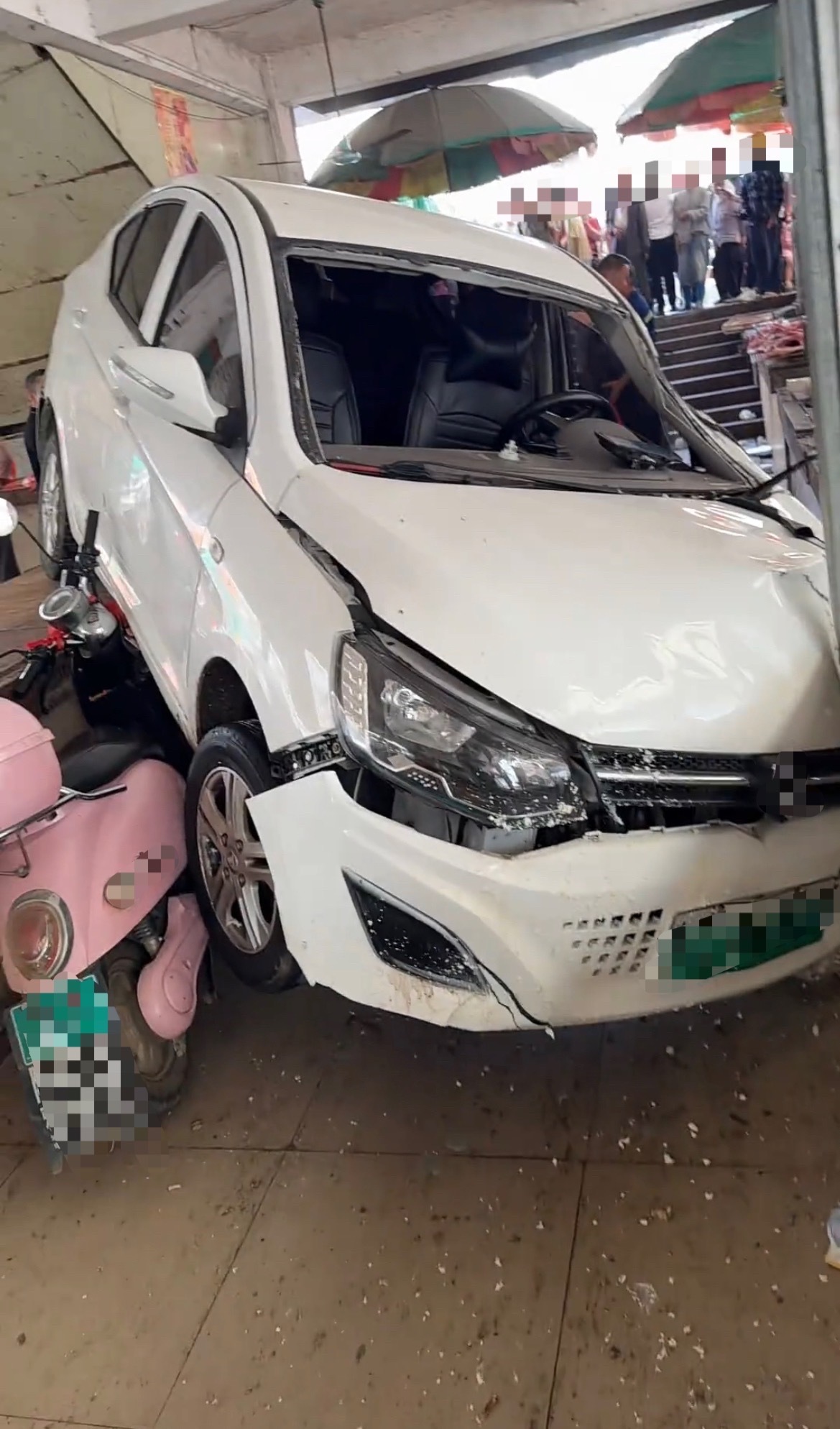 【贵港某丰市场新能源小车冲进猪肉行】4月26日,广西贵港一辆白色的新能源小轿车冲