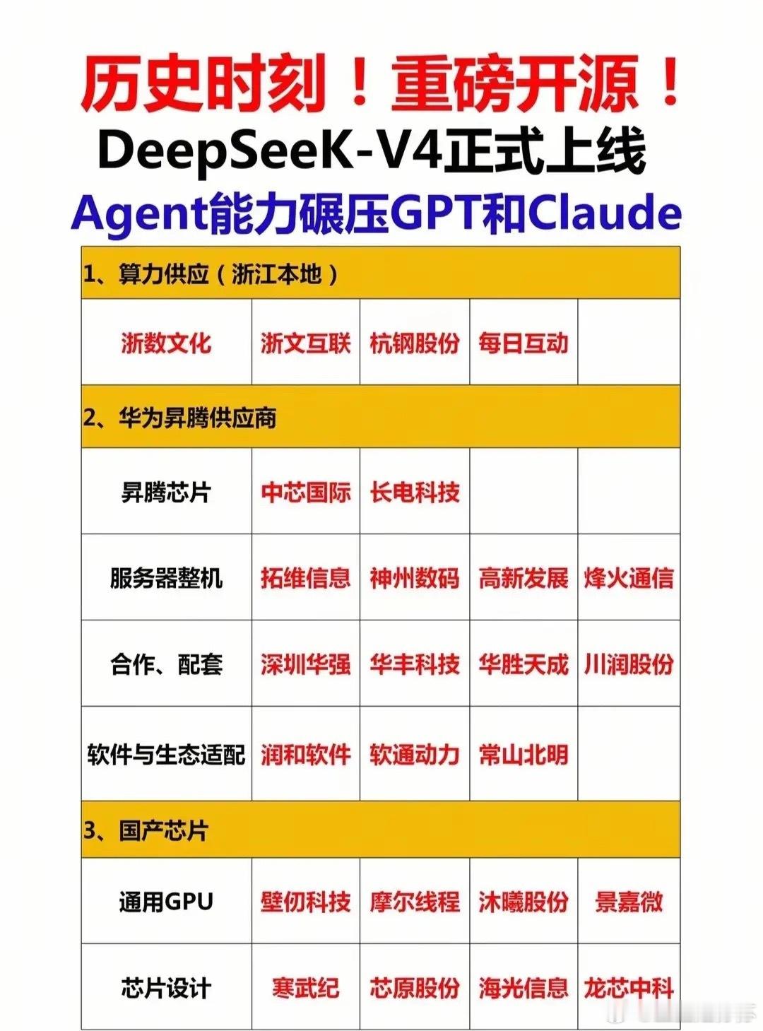DeepSeek-V4重磅开源,Agent能力强势领跑,国产AI再迎里程碑!搭配华为昇腾加持,全栈适配国产芯片,算力、半导体产业链全线沸腾,一场属于国产AI的技术革命正在加速到来!从浙江本地算力供应,到昇腾整机、芯片、半导体设备材料的全链条布局,再到超节点Scale Up的核心玩家,每一环都藏着产业升级的关键机遇。这些懂行的布局,正是抓住了国产AI算力自主可控的时代风口,以硬核技术实力,为DeepSeek的突破筑牢根基。