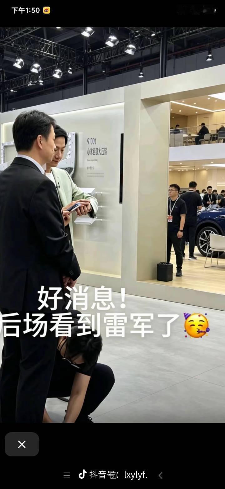 指同一个人拍到了同一时间另一个视角,黑衣服的是保镖,雷军在后面看表,中间站着一个人拿着手机,蹲下的工作人员在给自己系鞋带。
