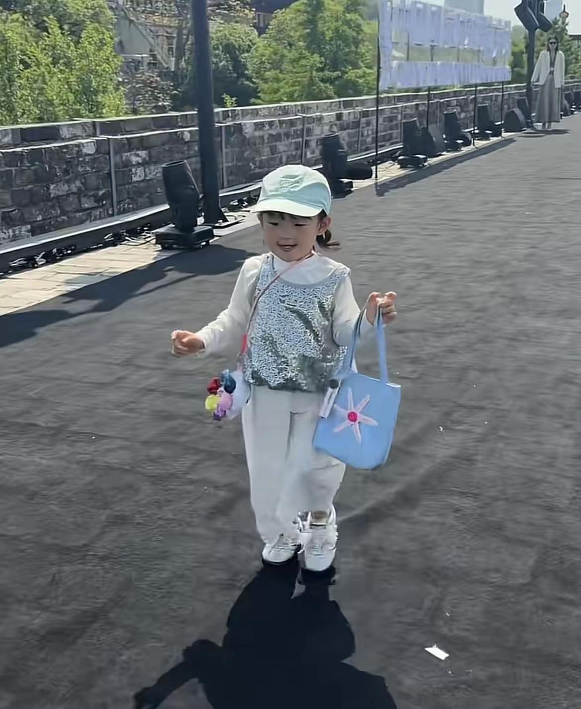 当天闪闪穿搭精致又亮眼,银色马甲外套搭配纯白色套装,手里提着小巧的蓝色包包,氛围感直接拉满。