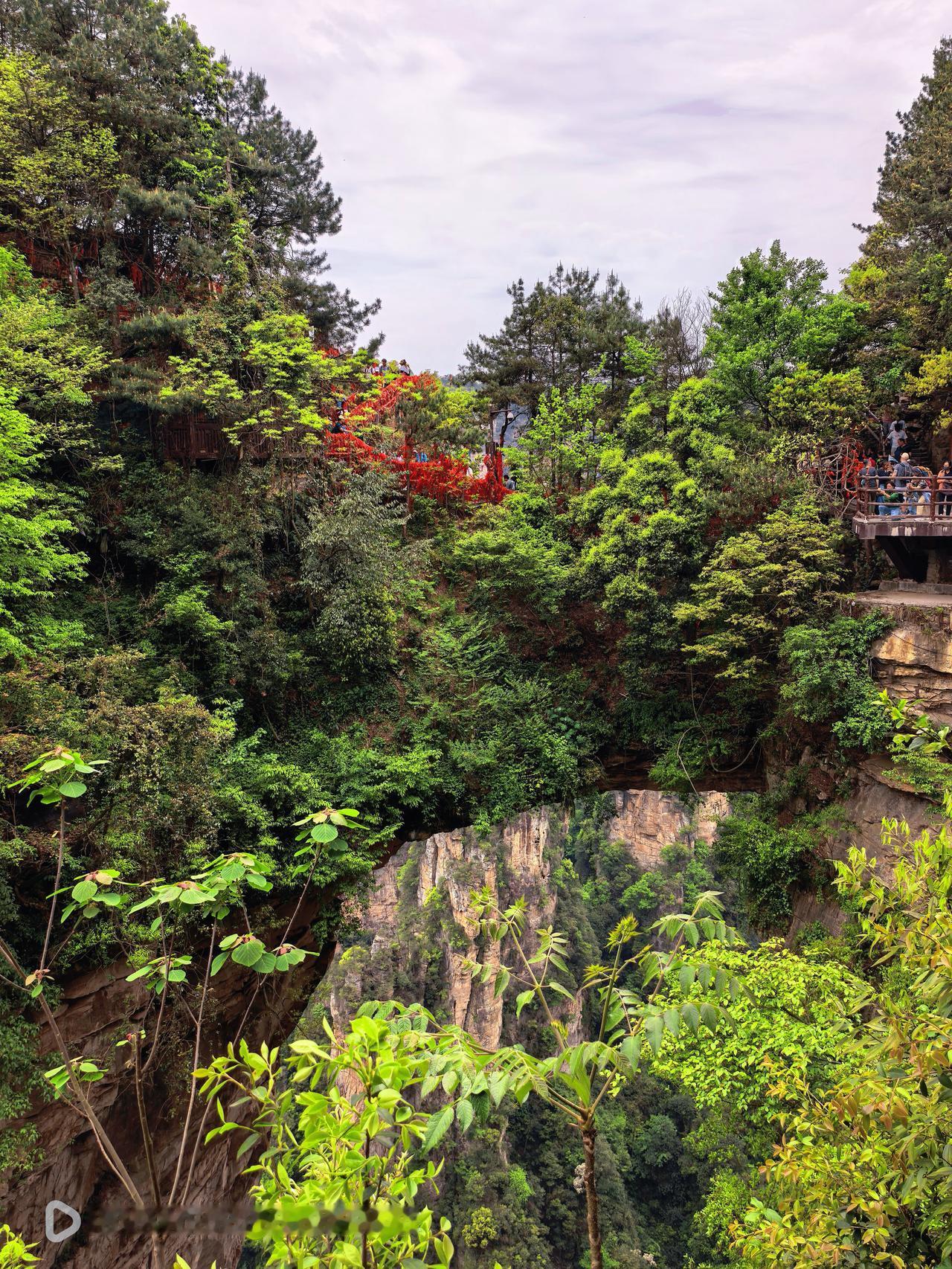 天下第一桥是张家界十大绝景之首,世界垂直高差最大的天然自生石板桥,桥高350米(