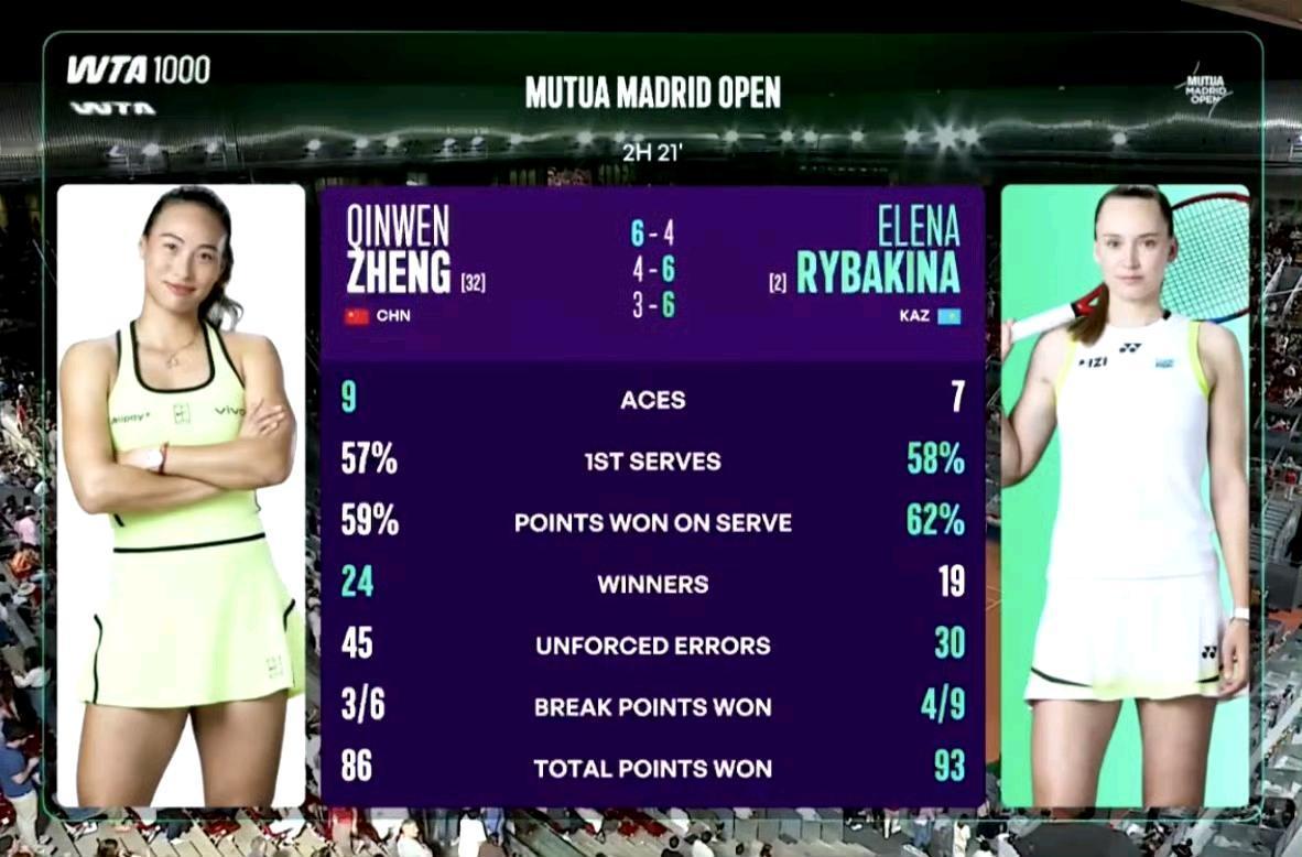 1-2!郑钦文再遭世界第二莱巴金娜逆转无缘马德里16强。每次都能和莱巴金娜战满三盘,但就是差那么一点意思。
