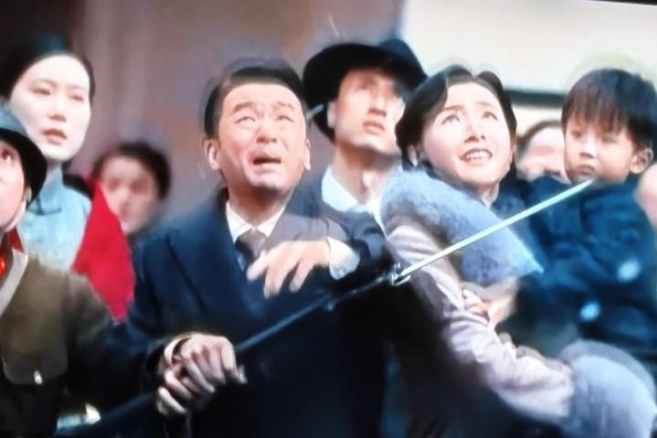 张汝贤拿着风筝去寻孙子,鬼使神差地登上了楼顶。他望着日本军队走来,误以为上海光复了。当他瞪大眼睛看清那膏药旗,确认是日本人时,大喊“不是这么回事,中国必胜”。风吹起他的白发,鼓起他长衫的后摆,雪花飘落于他的脸庞,他痛苦极了,喊了声“娘”便跌落下来。