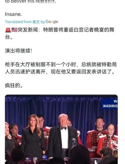 有人可能会杠,说晚宴最后还是改期了,又不是真的继续了。但大家要看态度,特朗普是主动提出让活动继续的,最终改期是特勤局和白宫记者协会的决定,出于安全考虑,并不是他怂了。