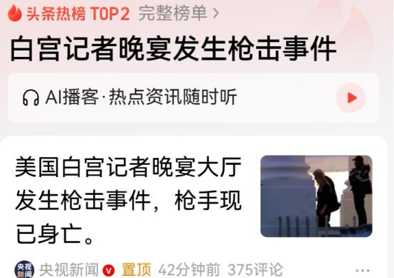 一开始外界都这么传,直到官方通报出来才纠正,枪手其实没被击毙,是被特勤局特工制服后送医评估了。这事儿发生在当地时间4月25日晚,特朗普本来是去参加白宫记者协会晚宴的,这还是他二次入主白宫后,第一次出席这个活动。