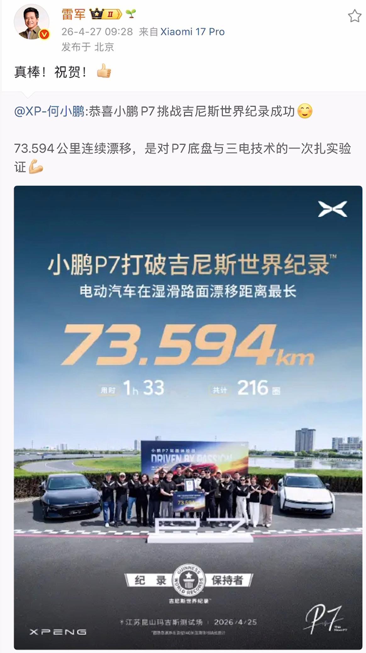 73.594km,216圈,小鹏P7又创吉尼斯世界纪录 。之前,保时捷Taycan用42.171公里的连续漂移,为纯电性能的划定开创了新的世界纪录。现在,小鹏P7用接近翻倍的连续漂移公里数,刷新记录。证明了自己,也证明了国产新能源的强。这波刷新记录,雷总也第一时间送上祝贺了。雷军祝贺小鹏P7破世界纪录