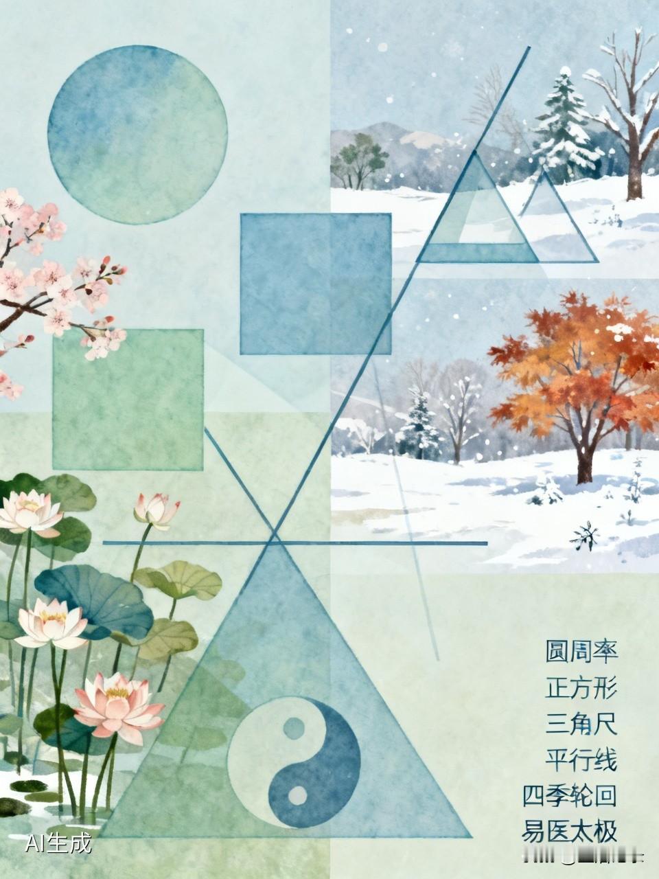 正方形有大有小,三角尺能拼出各种图形,平行线向两端无限延伸。四季轮回,易医太极蕴含哲理。数学和自然规律交织,让世界充满未知和惊喜。
