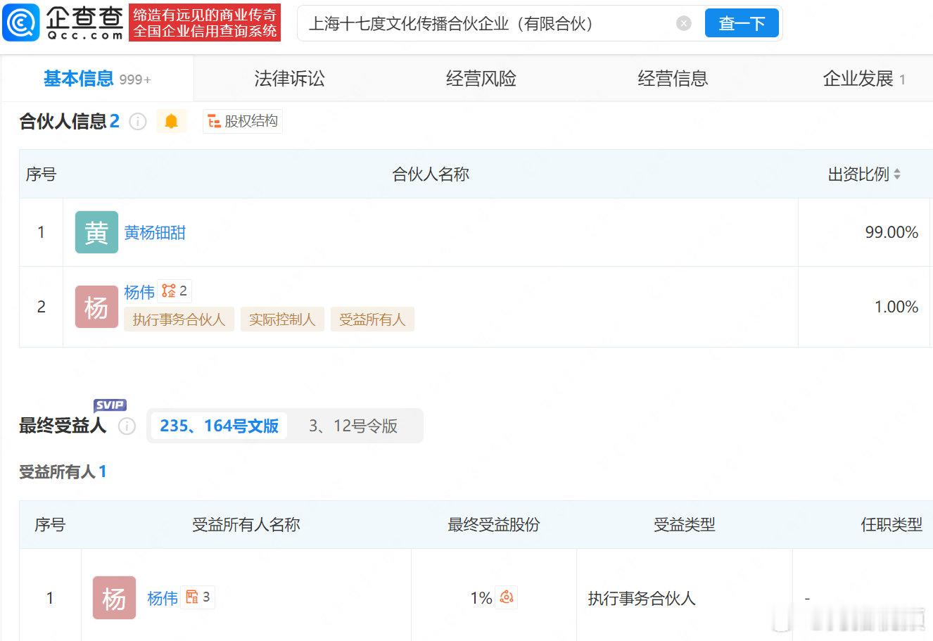企查查APP显示,去年12月,黄杨钿甜与父亲杨伟合资成立上海十七度文化传播合伙企业(有限合伙),该公司出资额10万元,执行事务合伙人为杨伟,经营范围包含组织文化艺术交流活动、项目策划与公关服务、文化娱乐经纪人服务、演出经纪、电影发行等,由黄杨钿甜、杨伟分别持股99%、1%。此外,杨伟名下还关联多家影视公司,包括深圳市国影影视文化传播有限公司、东阳市横店黄杨钿甜影视工作室。