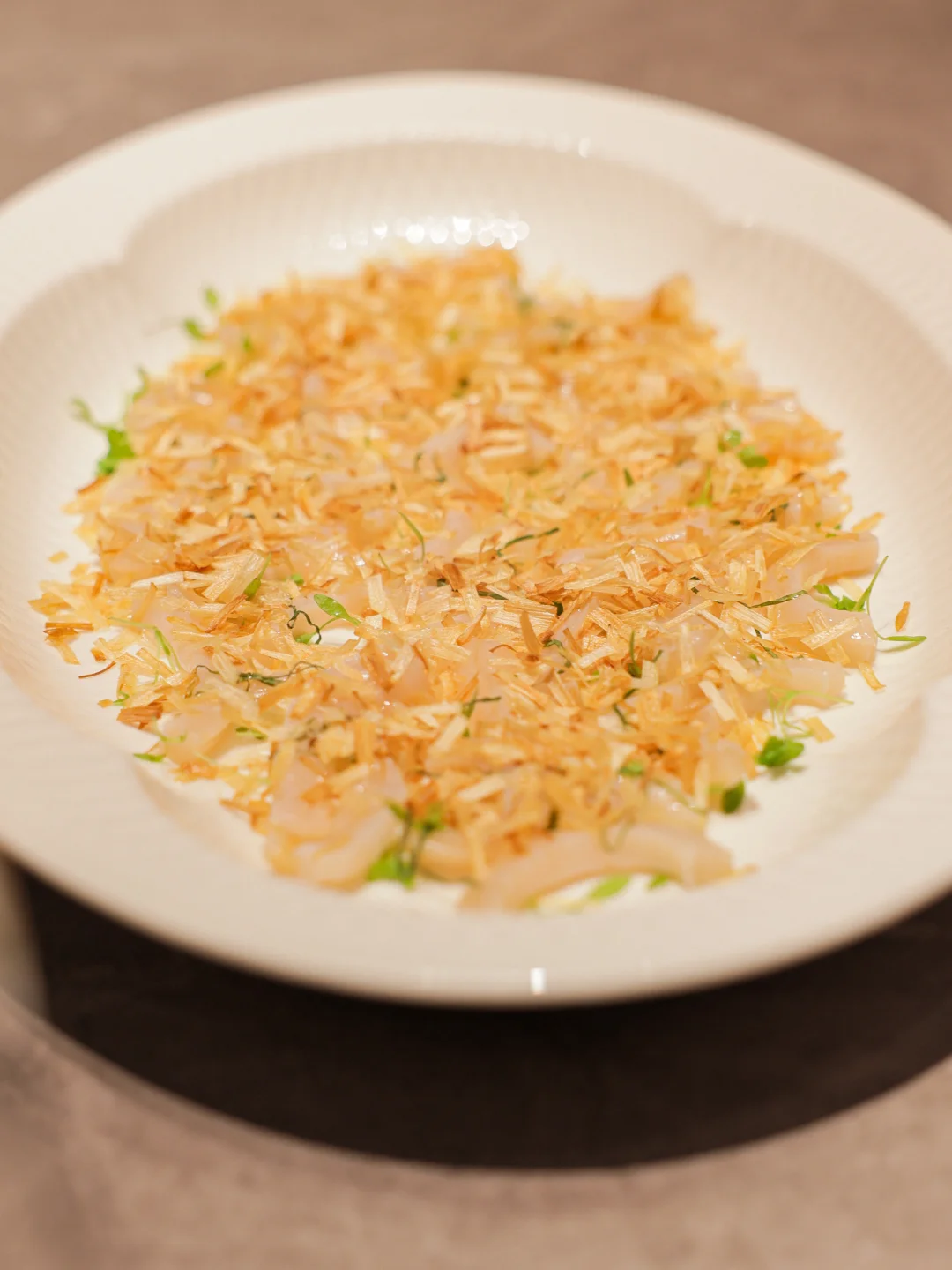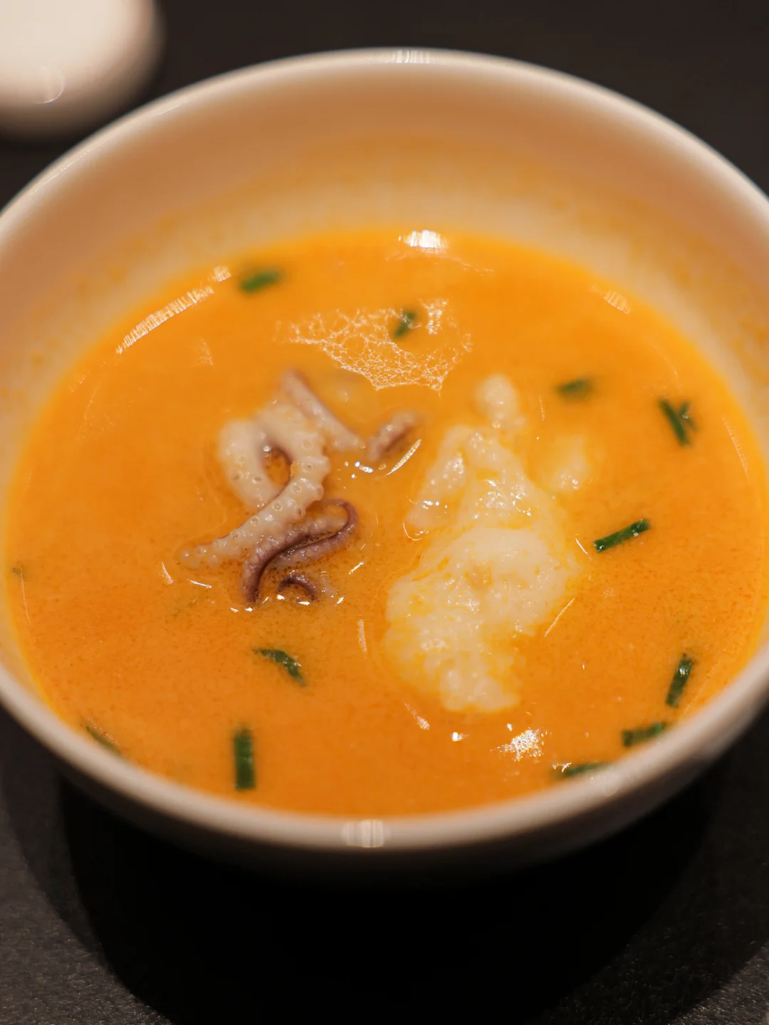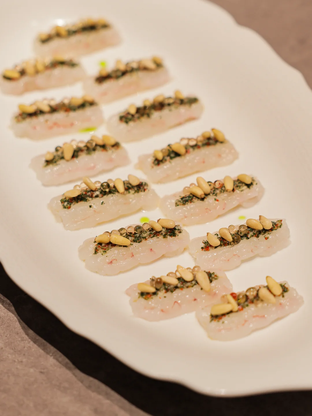 春卷里包着松叶蟹肉,然后叠加了一层蚕豆泥和咸蛋黄。吃的时候咬开春卷,再把鱼子酱酸奶盖上去:春卷的烫点缀着蟹肉的清甜、蚕豆泥的甜和咸蛋花沙沙的口感,与酸奶的奶香碰撞出来再配一些零星的鱼子酱,哇这一口真的太满足了!