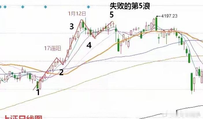 第二,如果接下来市场想要走创新高的第5浪的话,我们还得小心指数有可能走出失败的第5浪的走势。也就是说第5浪可能并不会创新高。第5浪的走势,只是不停的缓慢的重心上移。指数每天波动的点位都会在很窄的框架内。这一点我们可以看,上证指数在去年1月12号17连阳高点出现回撤之后,第2次探顶的走势。这个走势就是一个失败的第5浪大家看图二。失败的第5浪并没有创新高,但是看上去每一天都在上涨。不过这里的重点是,大家一定要注意到,失败的第5浪之后,市场迎来了一轮快速的垂直下跌行情。