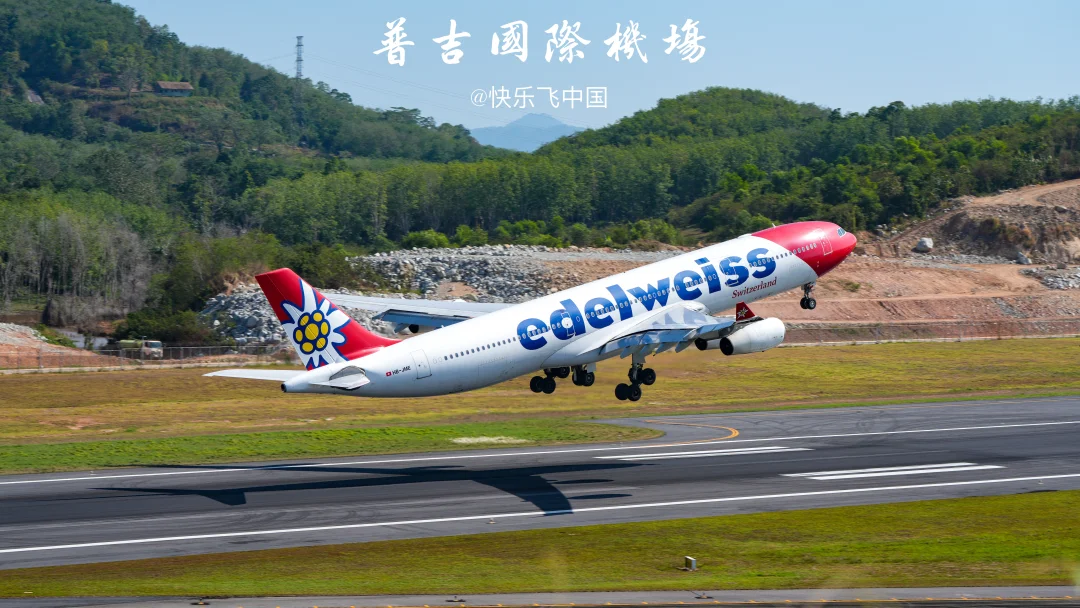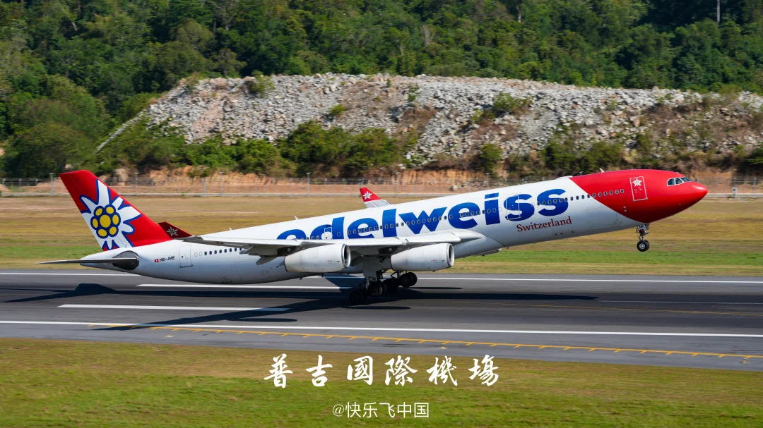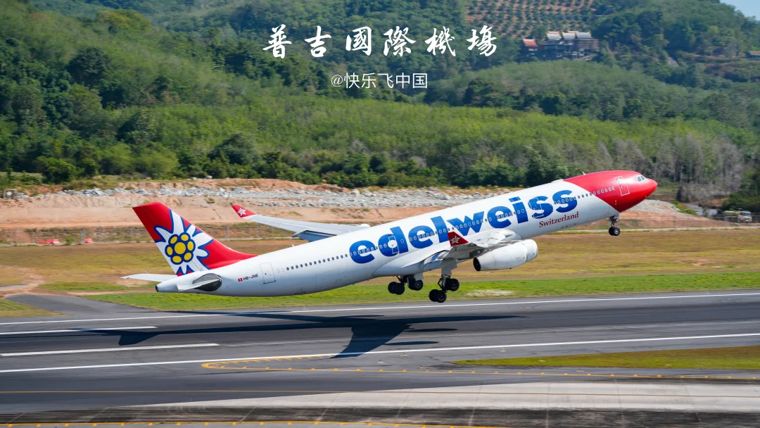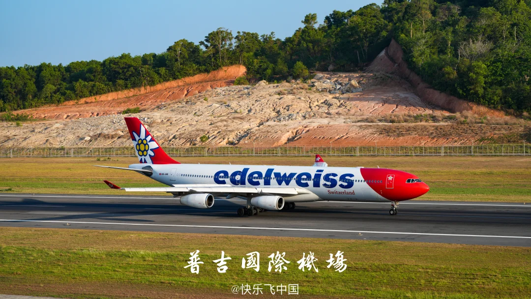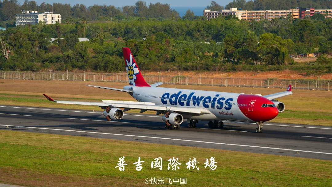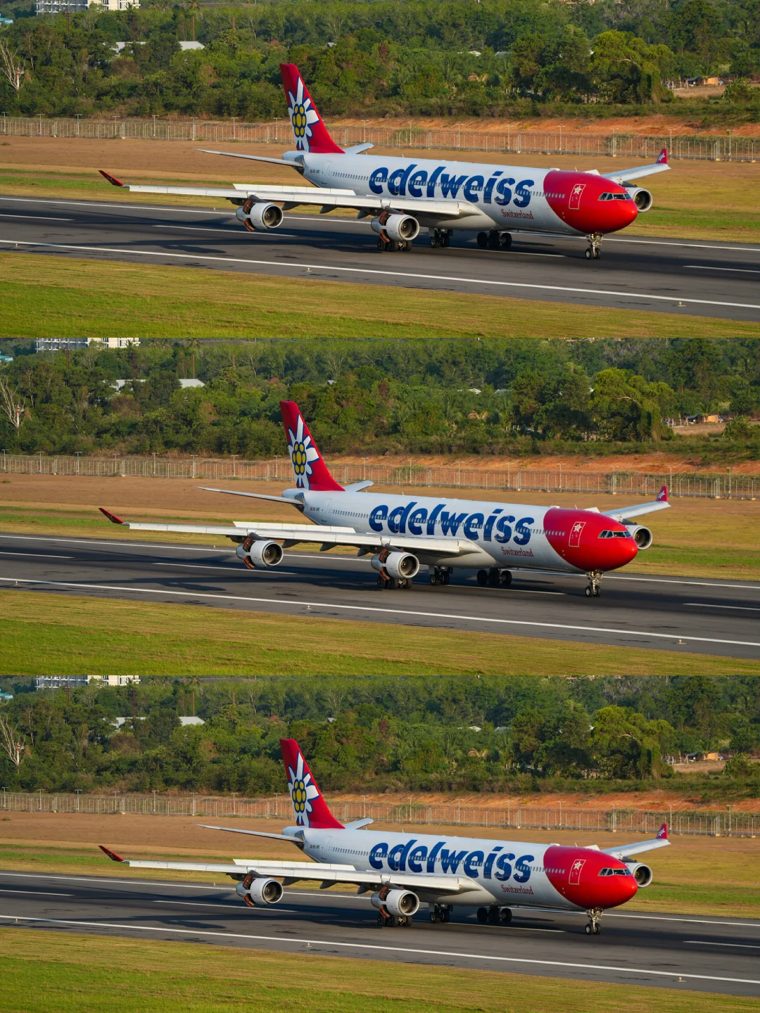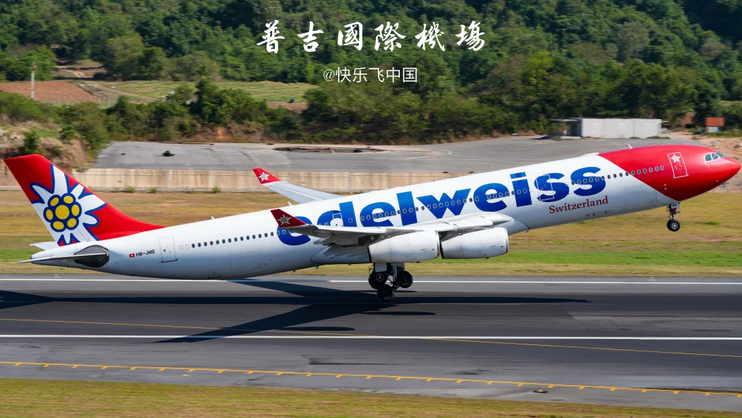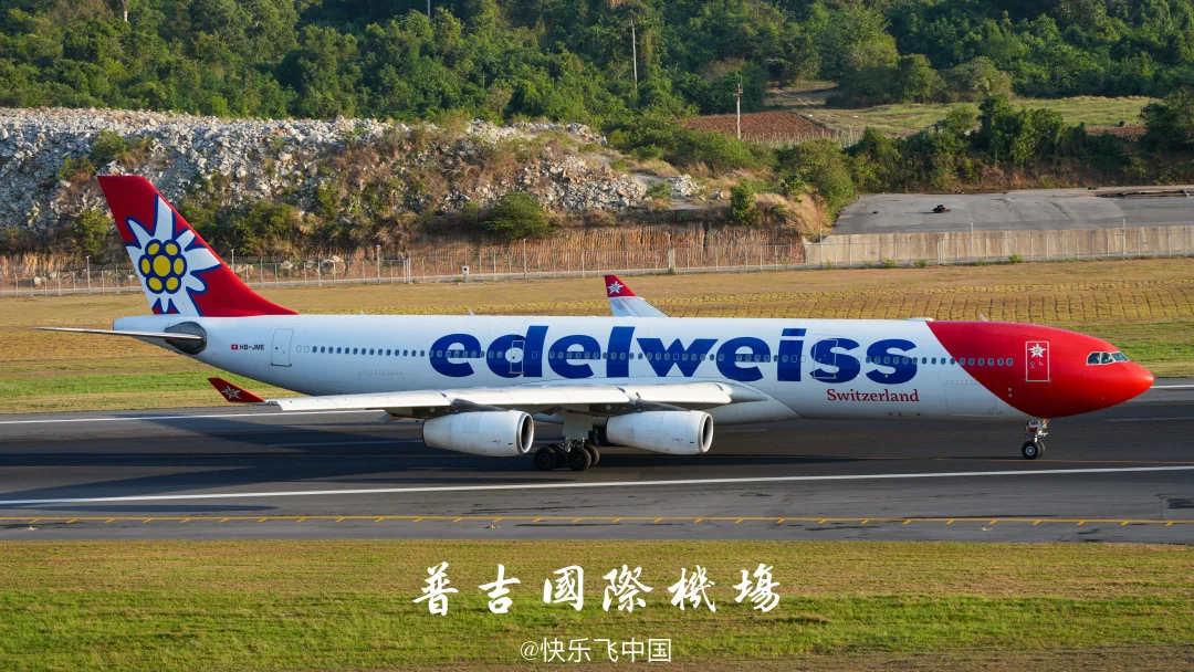 品牌标识最明显,机身上蓝色字体edelweiss,机舱门上各有一朵雪绒花,飞机尾垂上也各有一朵