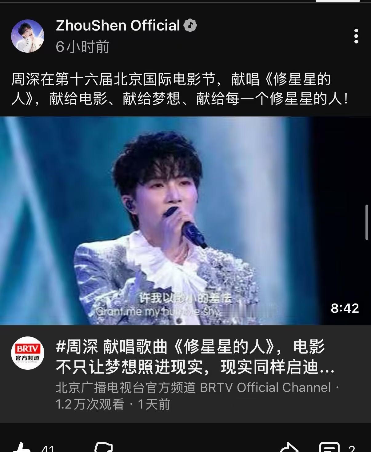 周深 📣4.27 柿子油管更新 📣【周深工作室】油管更新了深深在北影节舞台米