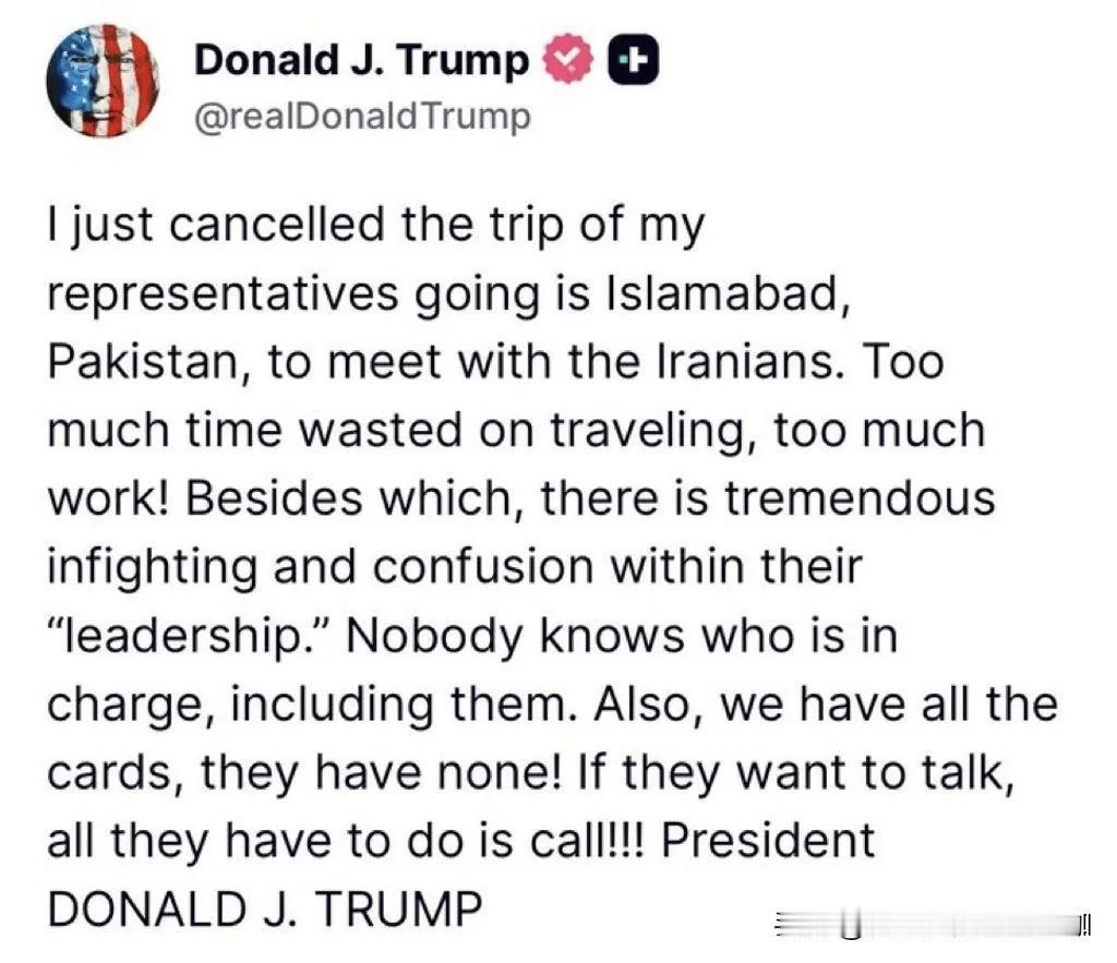 Social平台发文:“我刚刚取消了原定派代表前往巴基斯坦伊斯兰堡与伊朗方面会面