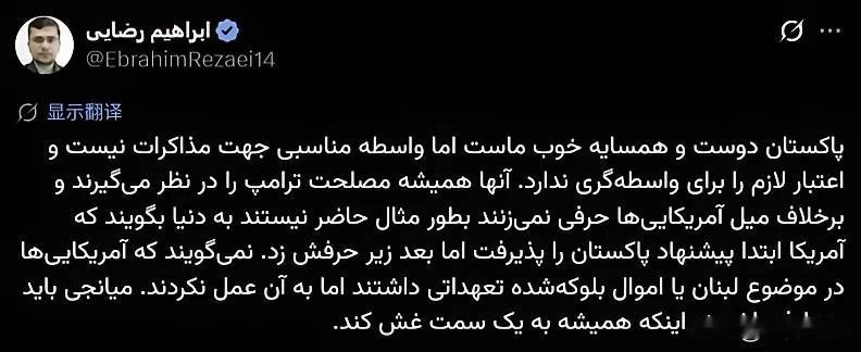 伊朗这就不厚道了!在当地时间27日,伊朗国家安全与外交政策委员会发言人雷扎伊在社交媒体上发言:“巴基斯坦是我们的友好邻邦,但它不是进行谈判的合适中间人,也没有充当中间人的必要信誉。他们总是考虑特朗普的利益,不会违背美国人的意愿说一句话。巴基斯坦真心实意的为美伊和谈而奔走,却被伊朗描述为偏袒,这对于巴基斯坦来说很不公平,从巴基斯坦的所作所为来说,完全对得起伊朗,对伊朗代表团不但来接去送,并且派高级官员接送,还竭尽全力保护了伊朗代表团的安全,并且对伊朗以兄弟相称,可以说已经尽到了自己最大的努力,至于说只考虑美国的利益,替美国人说话,没有充足的理由这么说,毕竟从相关的报道来看,巴基斯坦并没有明显的偏袒美国,伊朗的这种偏见是其固有的思维,在它们的眼里,巴基斯坦必须站在它们的立场来撮合会谈,你也不看看自己本身的能力,世界目前来看,还是属于弱肉强食的状态,即使巴基斯坦对美国有所偏袒也有情可原,希望伊朗能够正视现实,不要把自己当成超级大国,适当的站在巴基斯坦的立场上来考虑问题,不要恩将仇报。
