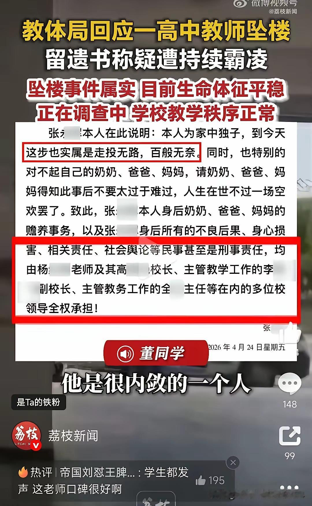 云南姚安一位高三教师留下遗书,称被学校某老师持续霸凌并点名学校一些领导,在教学楼
