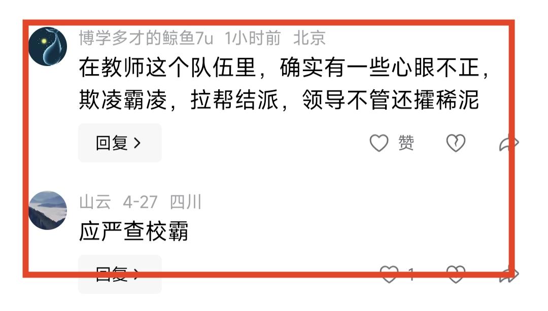 北京的一个网友留言说:在教师这个队伍里,确实有些人心术不正,拉帮结派,欺凌别人,学校领导还和稀泥,学校乌烟瘴气。