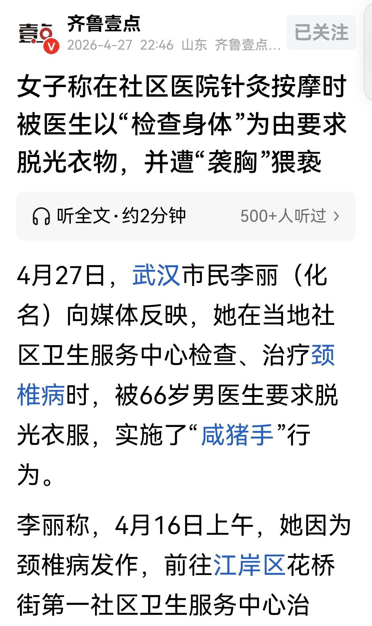 他“老不正经!”湖北武汉,一女子颈椎疼,去社区医院针灸按摩,一66岁男医生让她脱