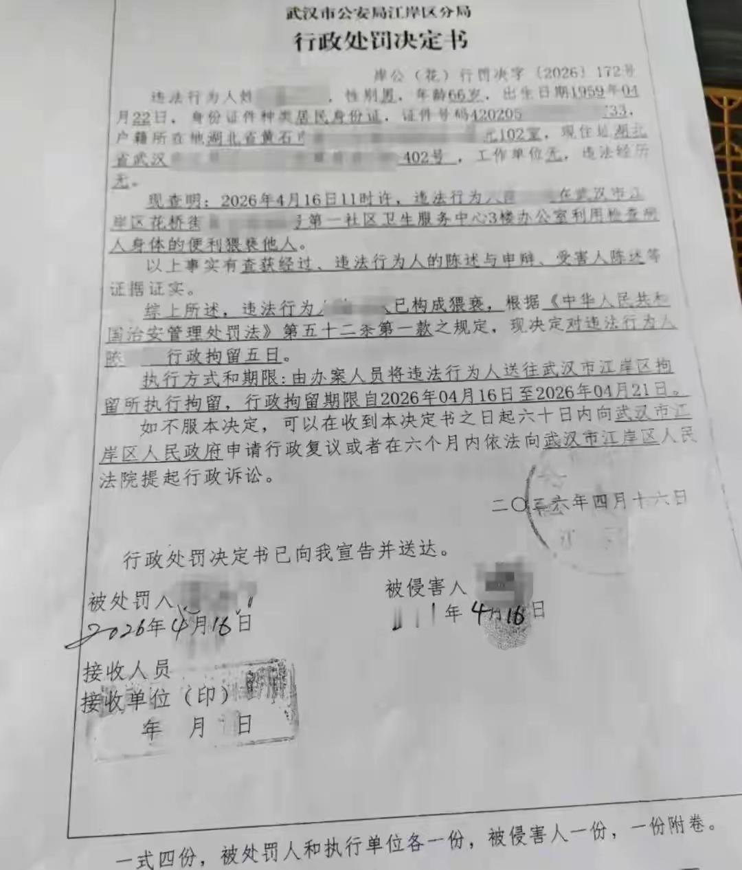 警方接警后,当天就有了结果:医生利用接诊检查的机会猥亵患者,证据确凿,直接给了行政拘留5天的处罚。