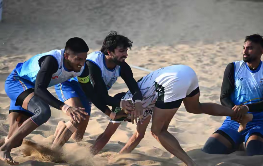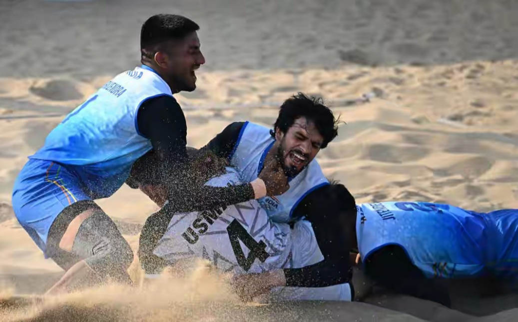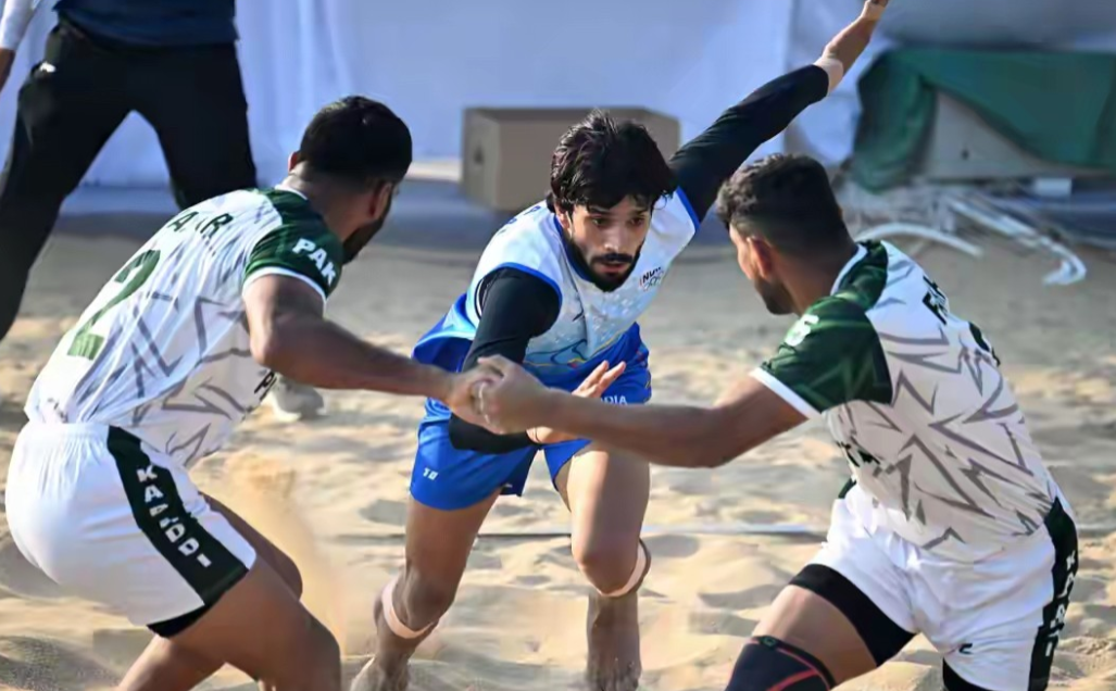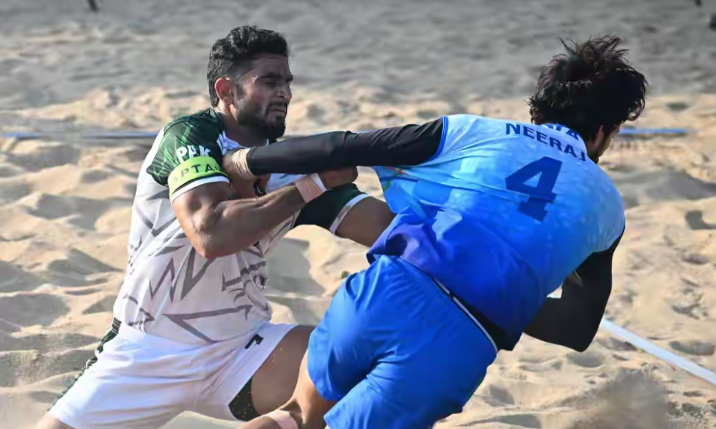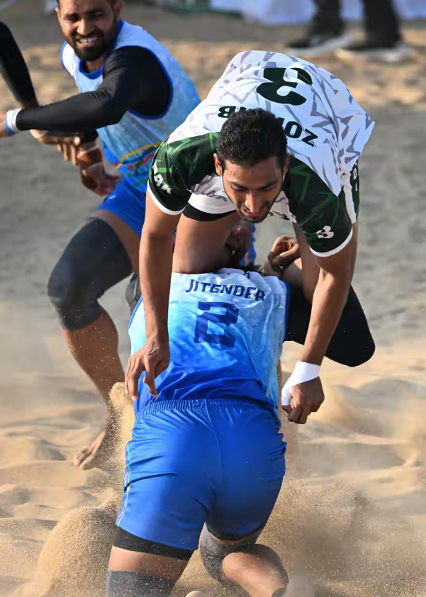 在海南三亚举行的第六届亚洲沙滩运动会进行了类似“老鹰捉小鸡”的沙滩卡巴迪男子项目的首场半决赛,印度队以50-28战胜卫冕冠军巴基斯坦队,率先晋级决赛,这个项目也是中国队本届赛事唯一没有参加的一个项目。