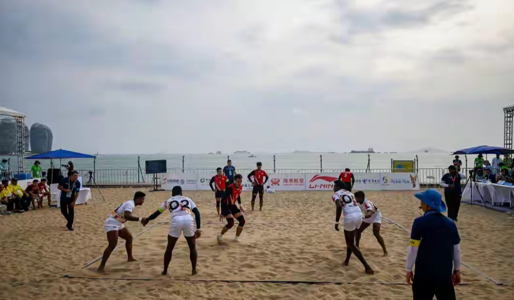 在海南三亚举行的第六届亚洲沙滩运动会进行了类似“老鹰捉小鸡”的沙滩卡巴迪男子项目