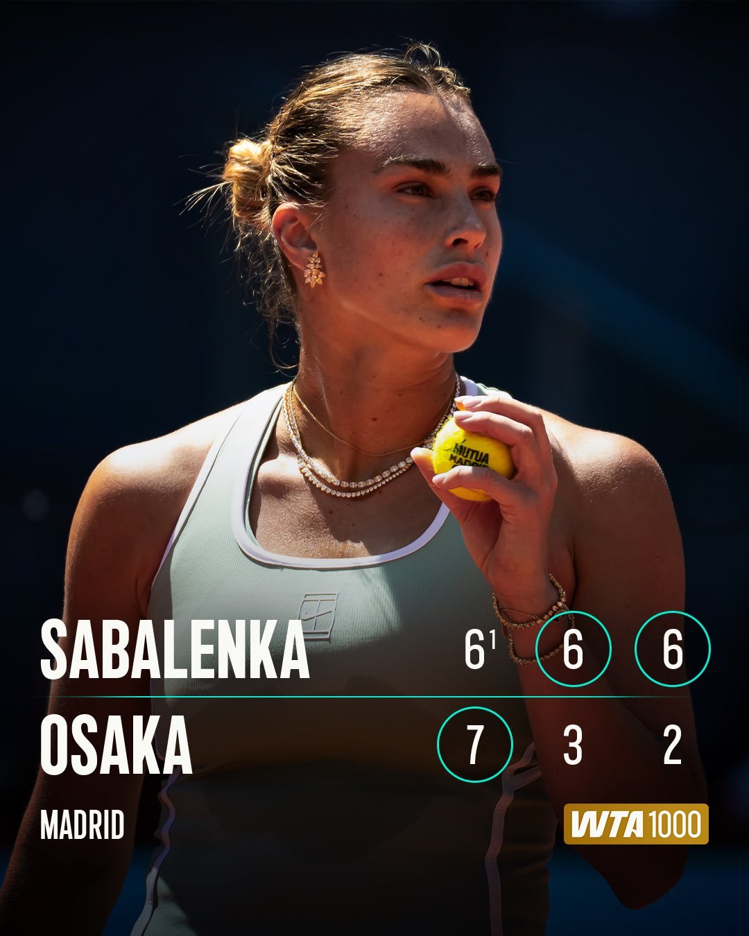 WTA马德里站女单第四轮战罢,萨巴伦卡抢七落败无碍晋级,鏖战三盘以6-7(1)/6-3/6-2逆转淘汰大坂直美,豪取15连胜晋级八强;高芙决胜盘抢七惜败以4-6/6-1/6-7(5)不敌诺斯科娃;红土赛季保持连胜的莱巴金娜在夜场爆冷出局,连丢两盘以6-7(8)/4-6负于波塔波娃