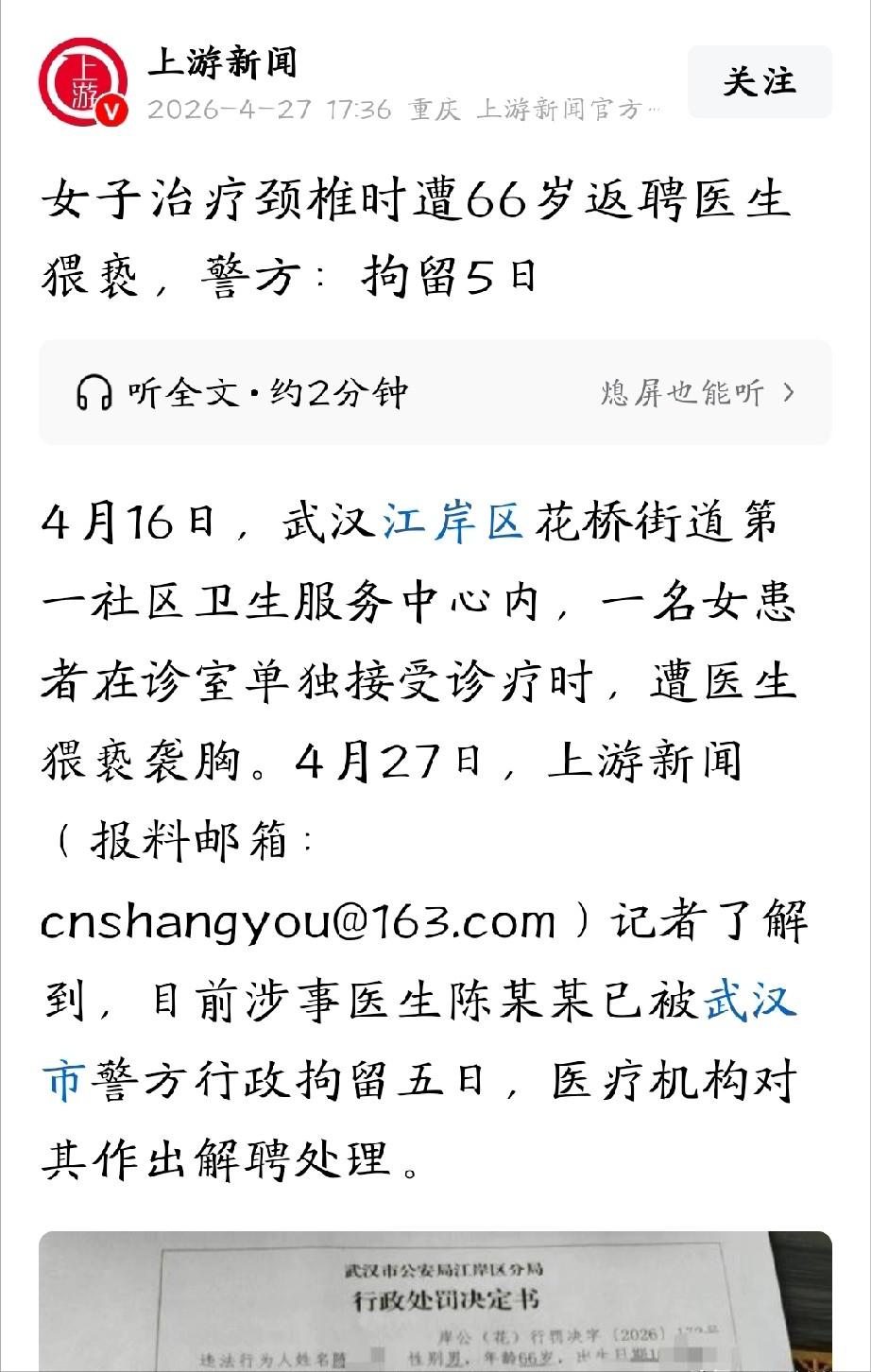 参考信息:上游新闻.(2026,4月27日).女子治疗颈椎时遭66岁返聘医生猥亵,警方:拘留5日