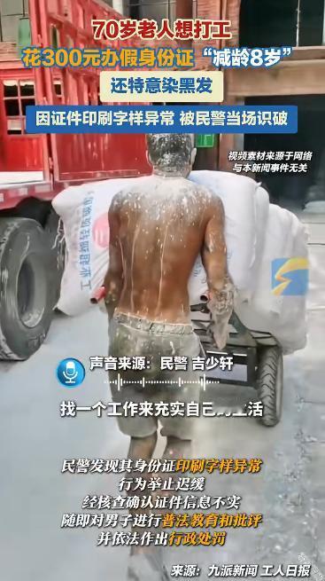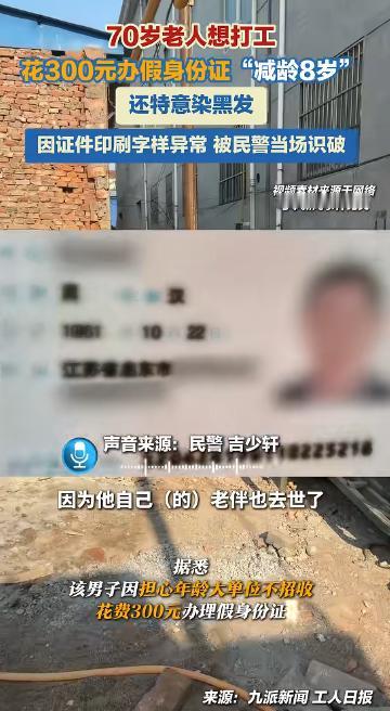 江苏一名七旬老人在老伴去世之后,为顺利务工,隐瞒真实年龄,花费三百元办理假身份证,刻意染发扮年轻。民警在其办理户籍证明时,发现证件字样异常,查实老人实际年龄比证件大八岁,最终被民警普法批评并依法行政处罚。