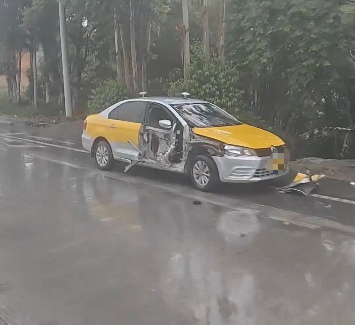 4月27日,网友反映:玉林北流教育城路口教练车和货车发生碰撞,导致出租车车门被撞