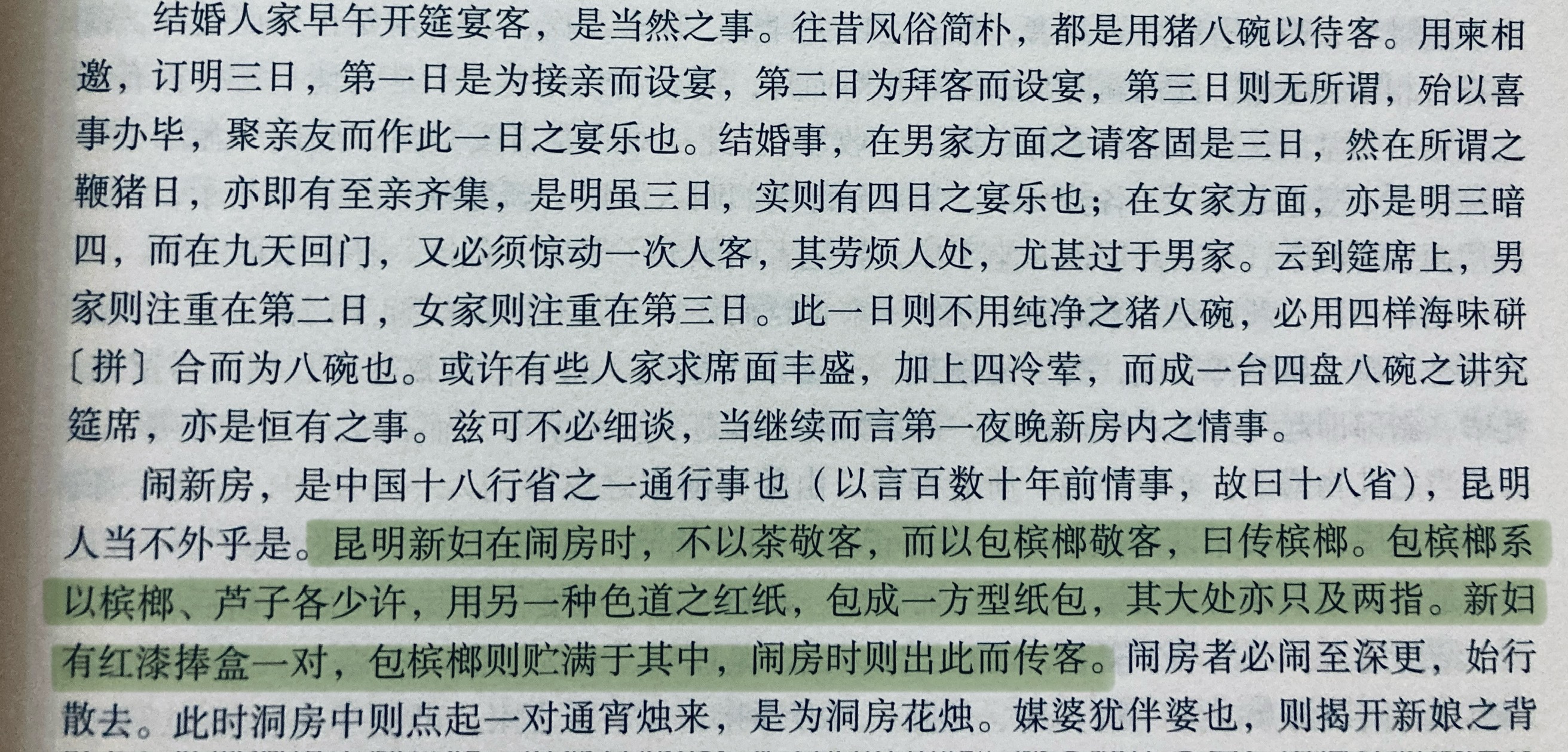 旧时昆明婚礼,酬谢宾客、媒婆皆用槟榔,倒是挺新鲜的,后文介绍昆明丧葬习俗,提及的酬谢食品里不见槟榔,似乎表明它确实有特定文化内涵。之前读介绍中国槟榔消费史的《一嚼两千年》,里面没有讲云南的情况。