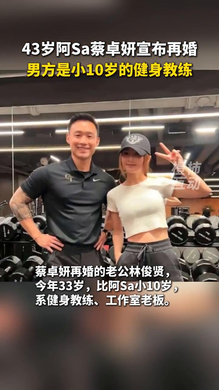 43岁阿Sa蔡卓妍宣布再婚,男方是小10岁的健身教练。4月28日,蔡卓妍发文宣布结婚:恭喜我嫁你,恭喜你娶我,以后请多多指教,多谢大家的祝福。