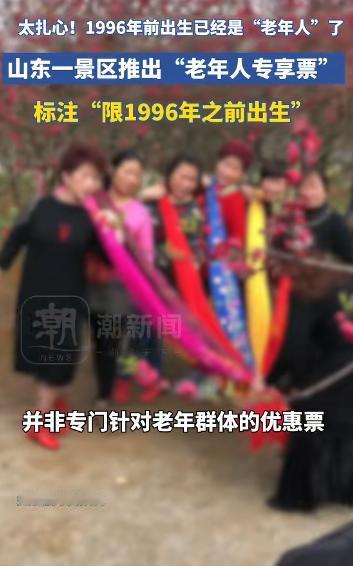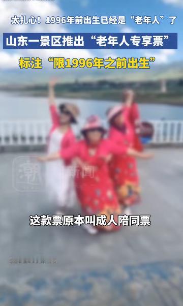 “太扎心了!”1996 年前出生算 “老年人”?山东聊城一景区推出 9.9 元低价特惠票,标注仅限 96 年前出生人群,老年二字还特意加引号。工作人员回应,此票原为陪同票,并非实际定义老年人,只是营销套路,趣味玩法引发众多网友热议评论。