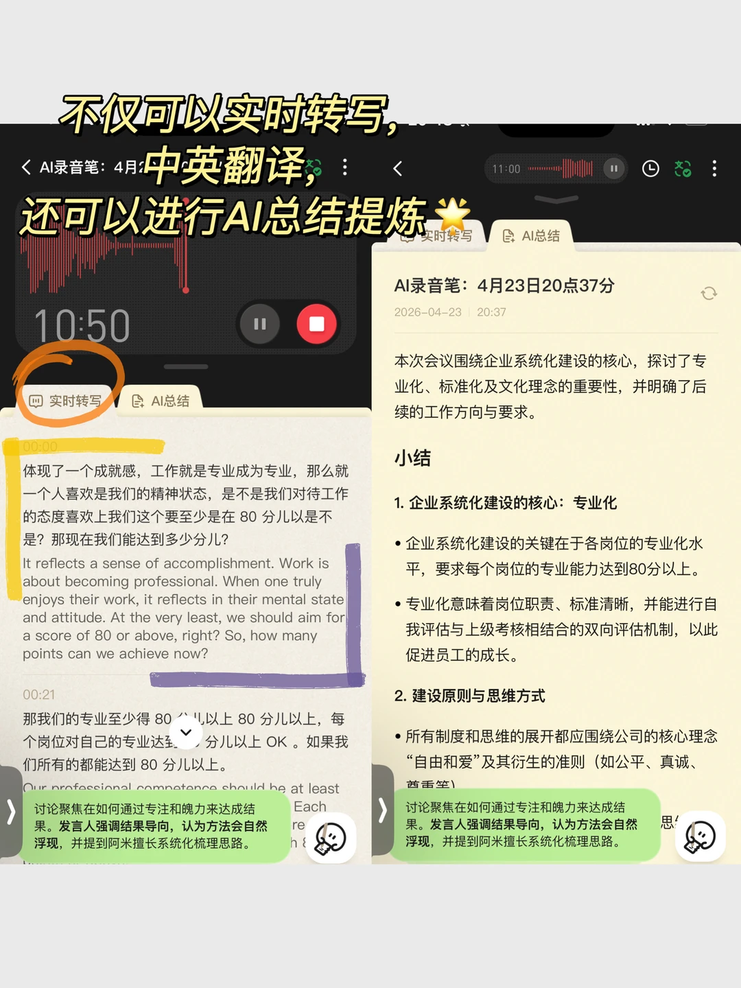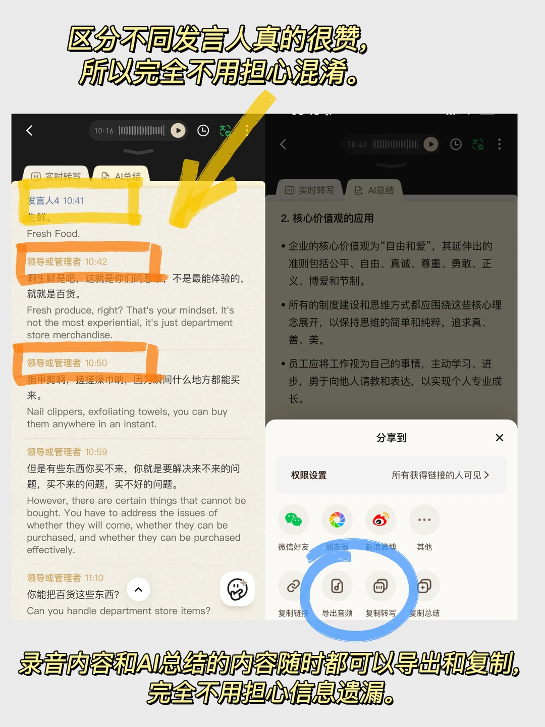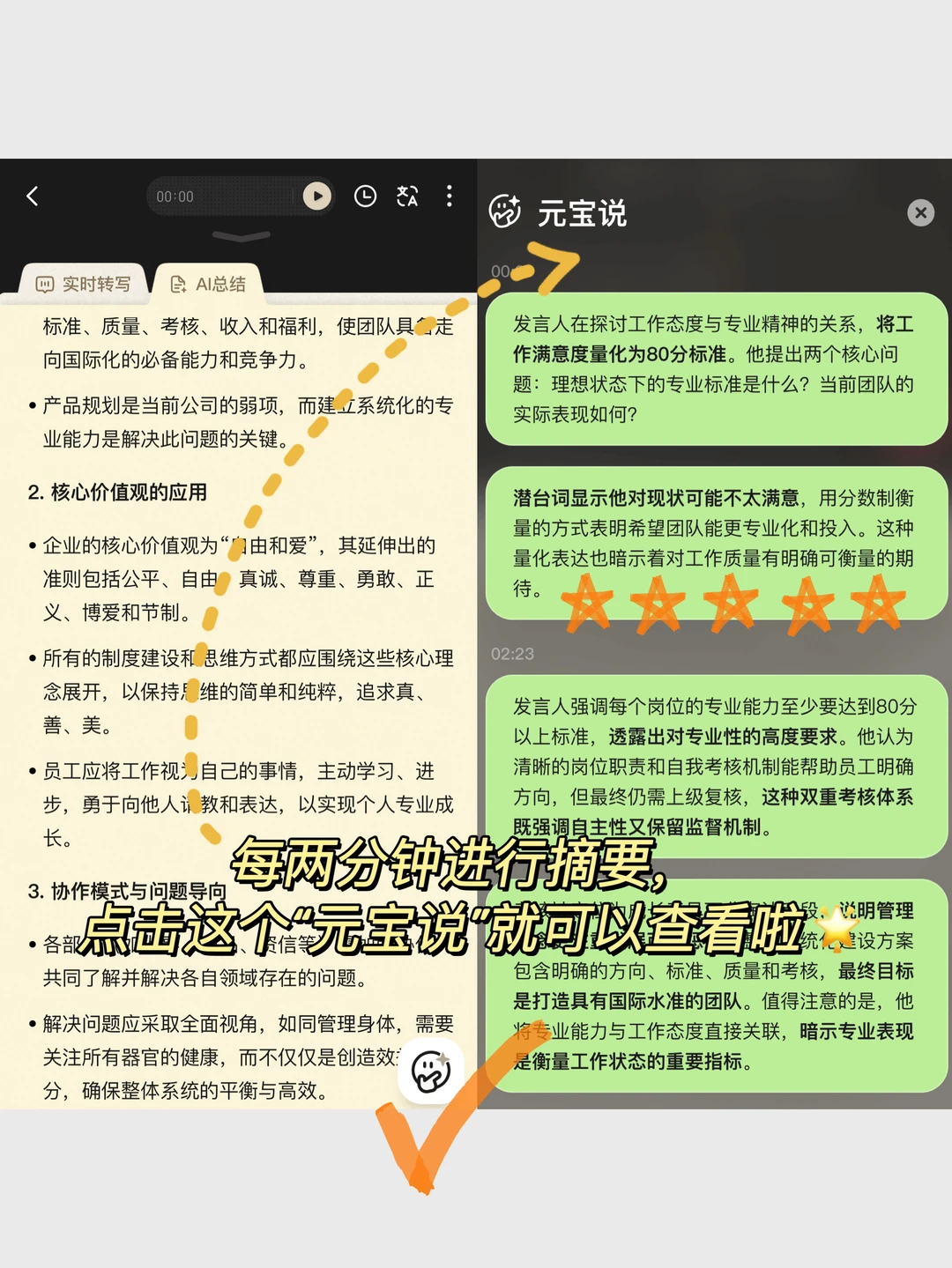 2.它能实时转写轻松记下所有重要重要信息,元宝说还能每2分钟进行摘要,还可以进行AI总结提炼,内容可以随时复制,真的非常高效