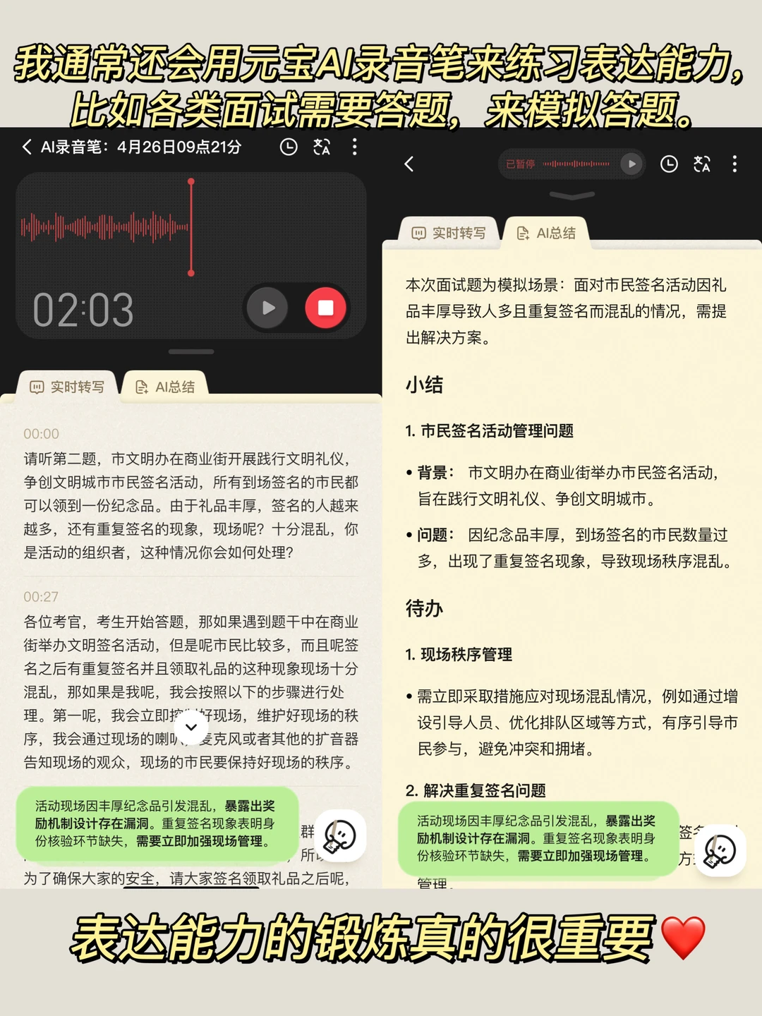 3.大家用这个元宝AI录音笔不仅可以用在工作的会议场合,还可以用于自己锻炼口头表达能力,真的能快速提升表达的水平