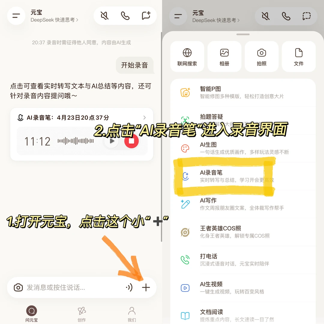 1.首先要打开元宝App,点击主界面的“+”,选择“AI录音笔”,进入录音界面。点击“开始录音”就可以正式录音啦。还可以自动识别中英文,区分不同发言人。