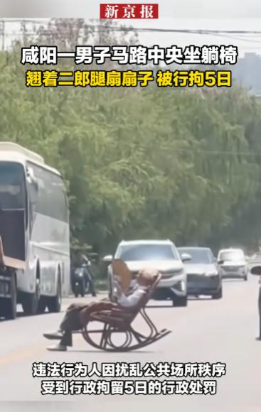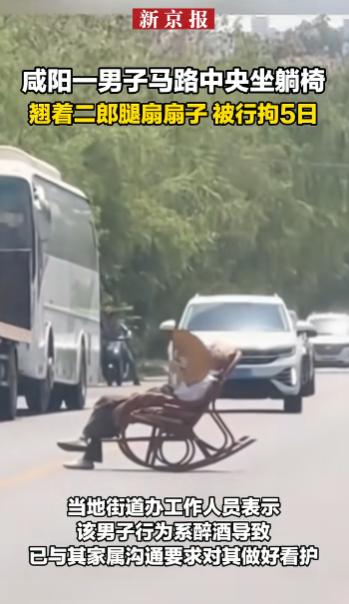 离谱至极!陕西咸阳一男子醉酒失控,胆大妄为直接在马路中央摆放躺椅肆意躺坐,严重扰乱公共秩序,阻碍交通暗藏巨大安全隐患。目前该男子已被警方依法抓获,处以行政拘留五日处罚,相关部门已联系其家属严加看管约束。