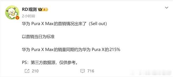 华为PuraXMax首销销量曝光 【最强阔折叠!华为PuraXMax首销卖爆 :销量是Pura X的两倍多】4月28日消息,博主RD观测爆料,华为Pura X Max的销量表现极为强劲,达到了Pura X同期销量的215%。