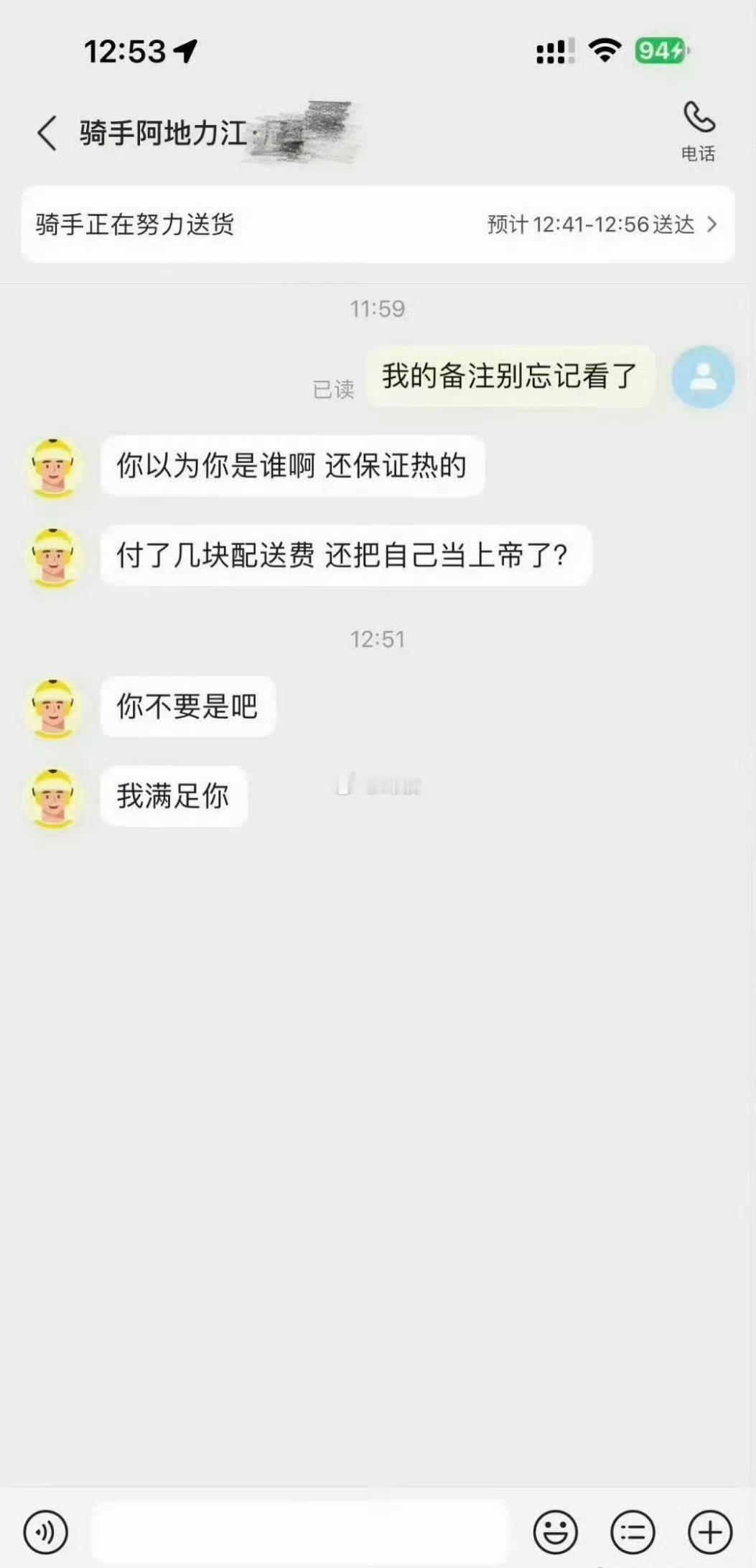 Pretend 15 2026-04-29 09:08 这种人直接投诉我一般都不会投诉别人,但是惹我不高兴,我肯定会投诉不管是快递还是外卖,我都能理解他们的辛苦,也愿意打赏,但是惹我不高兴的我肯定会往死里投诉 Ding 回复 04-29 10:47 这种就是惯的了。不知道怎么回事送外卖的,开网约车的一个个牛逼的不行,还动不动就威胁。
