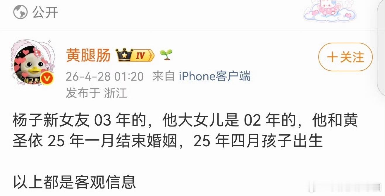 杨子2025年1月离的,4月就生,倒推怀孕在2024年中,婚内时间线全对上了……一边跟黄圣依演《再见爱人》博同情,另一边已经无缝衔接生子了啊