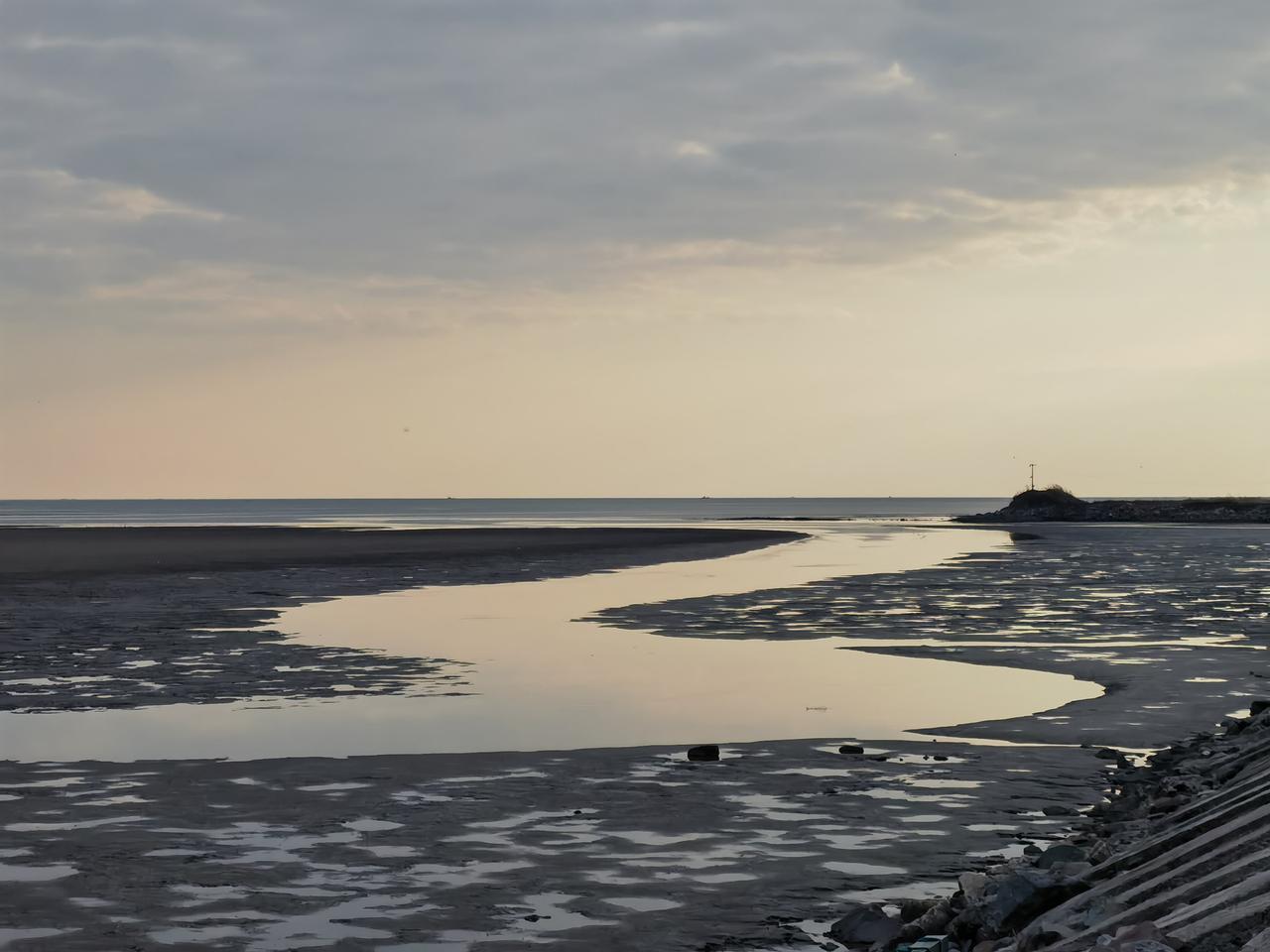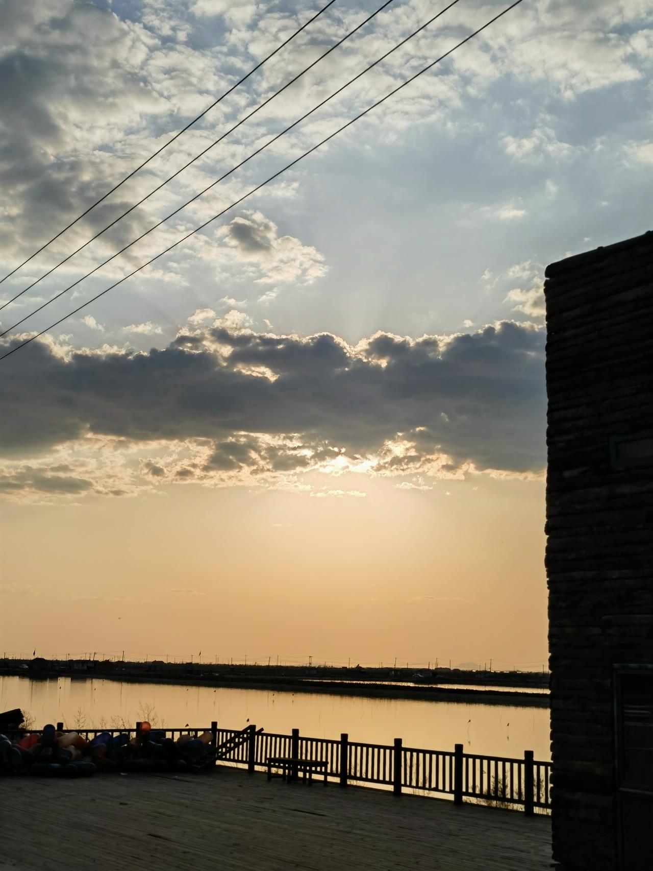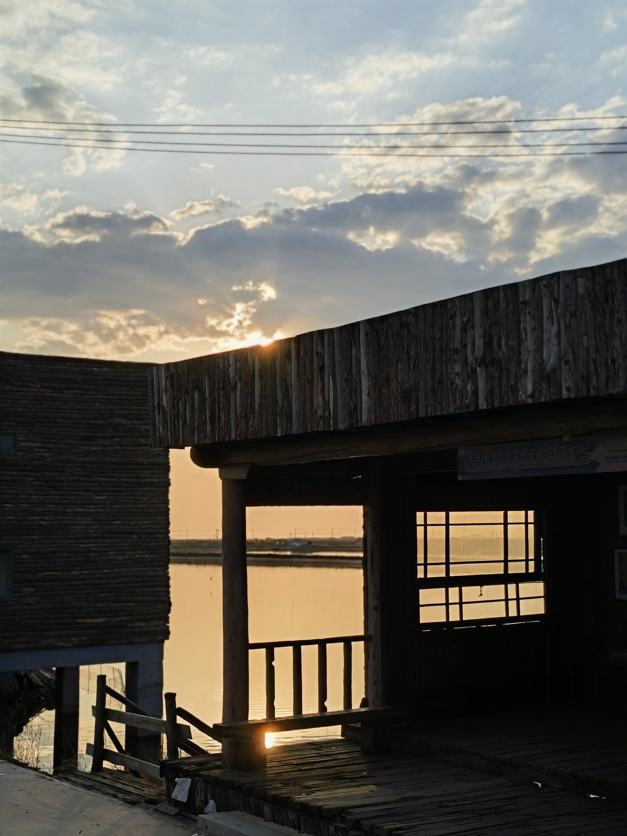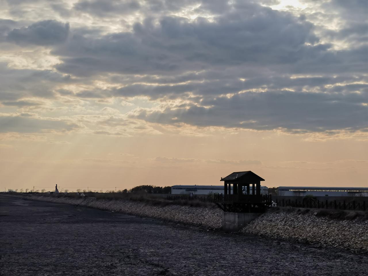 丹东东港黄昏海滨印象 画外:黄海海面上,迁徙的候鸟不时在表演着鸟浪,星星点点的渔船点缀在灰色的海面和天空间;穿过云层的阳光打在丹东港的堤岸上,在天海间形成一条金线,几座红色的塔吊和两座红色的龙门吊在述说着海港的寂寞。