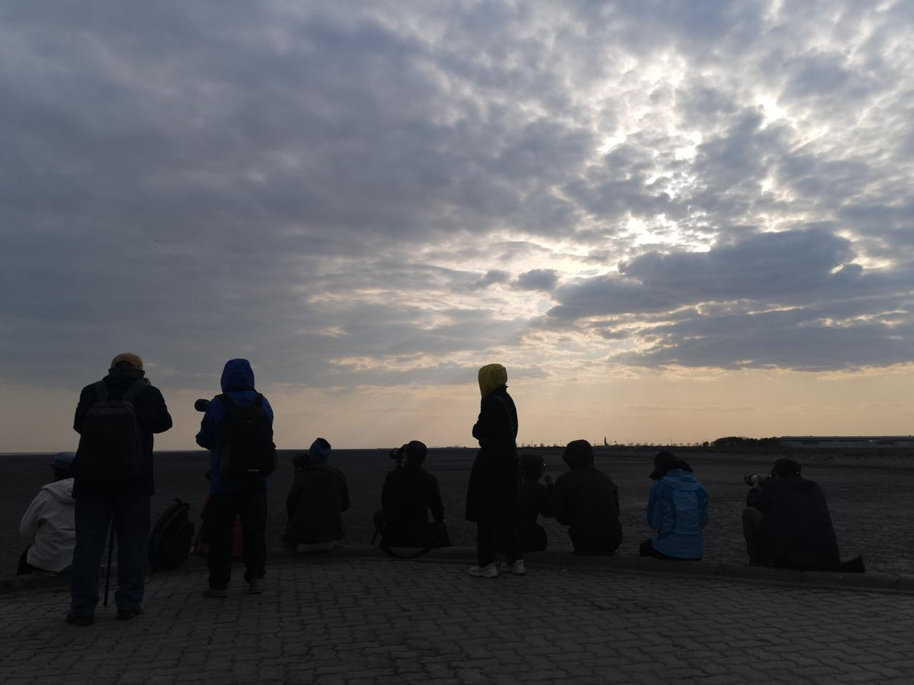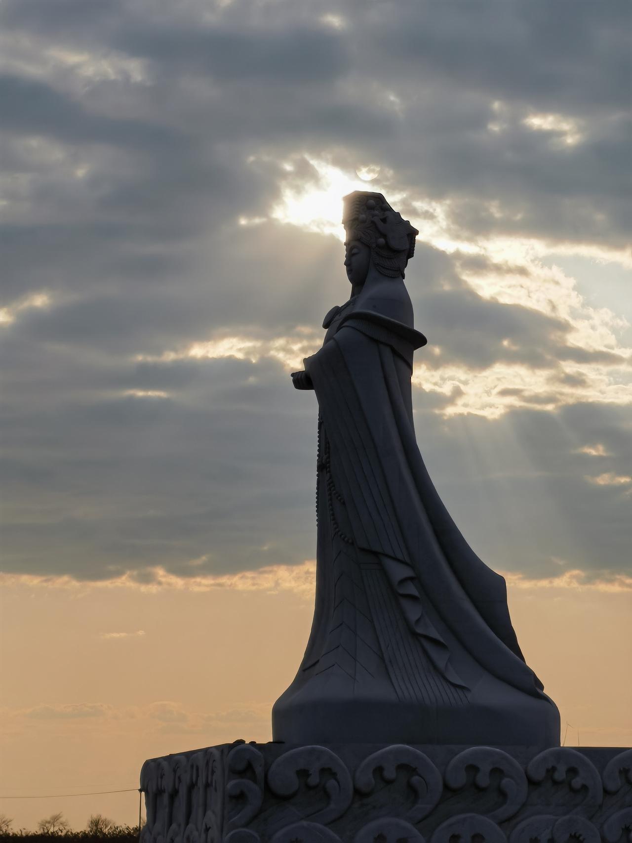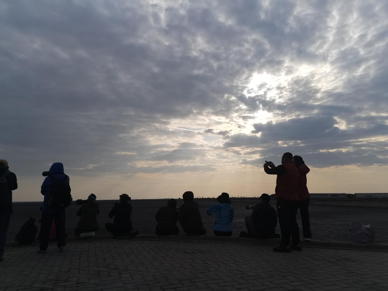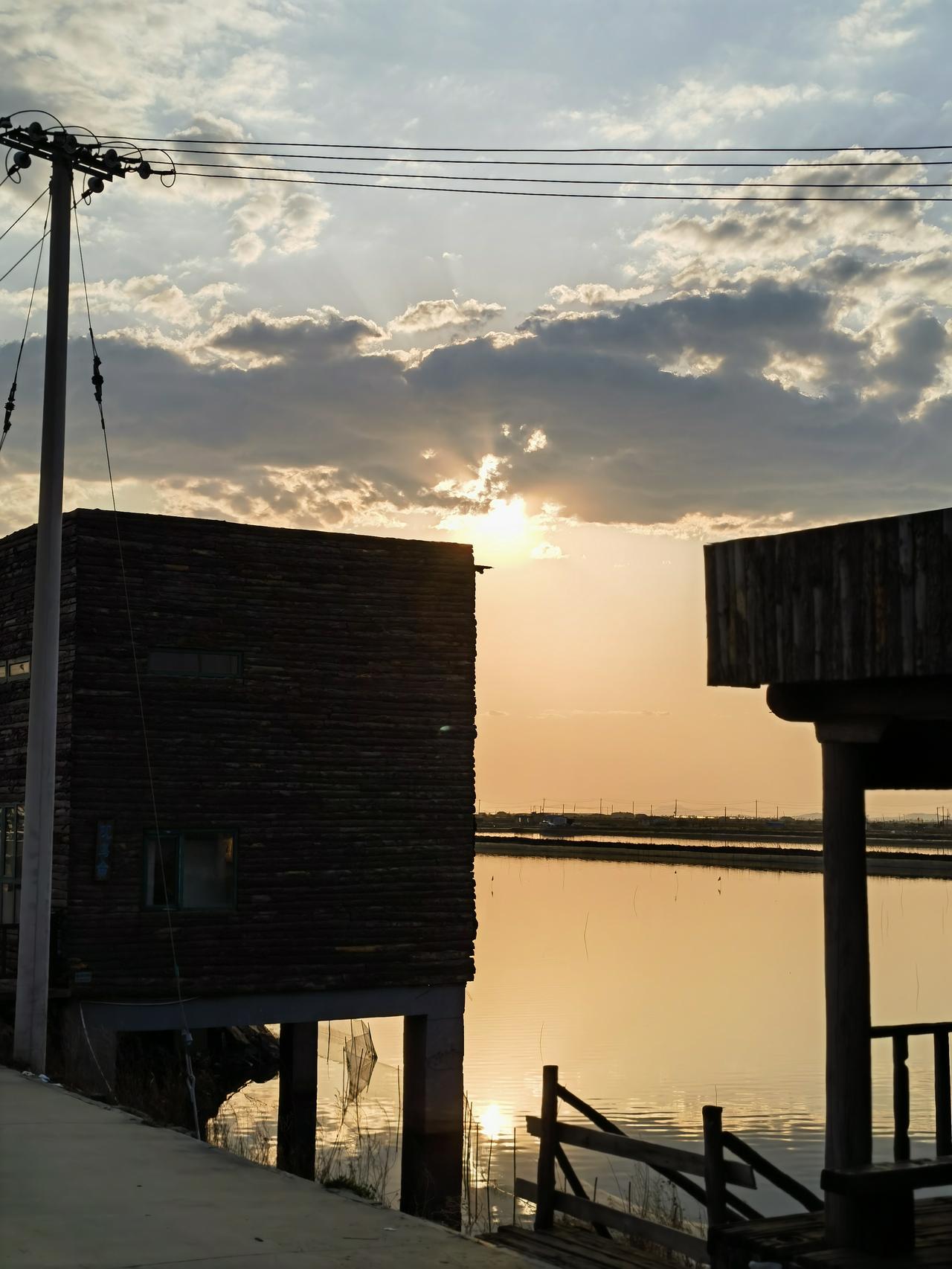 丹东东港黄昏海滨印象 画外:黄海海面上,迁徙的候鸟不时在表演着鸟浪,星星点点的渔船点缀在灰色的海面和天空间;穿过云层的阳光打在丹东港的堤岸上,在天海间形成一条金线,几座红色的塔吊和两座红色的龙门吊在述说着海港的寂寞。
