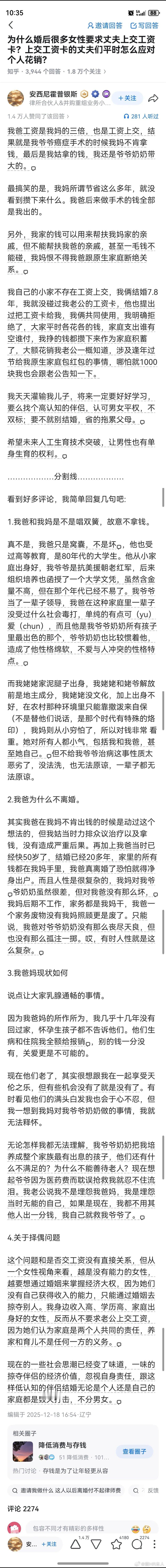 一位女同胞的认知,通过爸爸的遭遇,强烈建议男的不要上交工资卡。她说,现在的一些社